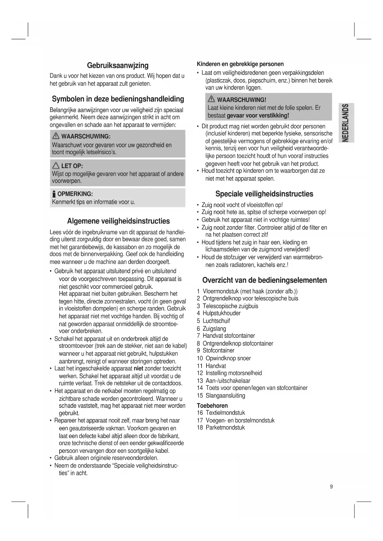 - Houd de stofzuiger ver verwijderd van warmtebron- nen zoals radiatoren, kachels enz.! Overzicht van de bedieningselementen 1 Vloermondstuk (met haak (zonder afb.)) 2 Ontgrendelknop voor telescopische buis 3 Telescopische zuigbuis 4 Hulpstukhouder 5 Luchtschuif 6 Zuigslang 7 Handvat stofcontainer 8 Ontgrendelknop stofcontainer 9 Stofcontainer 10 Opwindknop snoer 11 Handvat 12 Instelling motorsnelheid 13 Aan-/uitschakelaar 14 Toets voor openen/legen van stofcontainer 15 Slangaansluiting Toebehoren 16 Textielmondstuk 17 Voegen- en borstelmondstuk 18 Parketmondstuk Gebruiksaanwjzing Dank u voor het kiezen van ons product. Wij hopen dat u het gebruik van het apparaat zult genieten. Symbolen in deze bedieningshandleiding Belangrijke aanwijzingen voor uw veiligheid zijn speciaal gekenmerkt. Neem deze aanwijzingen strikt in acht om ongevallen en schade aan het apparaat te vermijden: WAARSCHUWING: Waarschuwt voor gevaren voor uw gezondheid en toont mogelijk letselrisico’s. LET OP: Wijst op mogelijke gevaren voor het apparaat of andere voorwerpen. OPMERKING: Kenmerkt tips en informatie voor u. Algemene veiligheidsinstructies Lees vóór de ingebruikname van dit apparaat de handlei- ding uiterst zorgvuldig door en bewaar deze goed, samen met het garantiebewijs, de kassabon en zo mogelijk de doos met de binnenverpakking. Geef ook de handleiding mee wanneer u de machine aan derden doorgeeft.