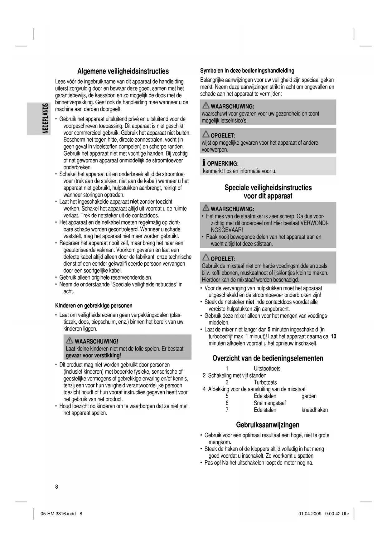 • Het mes van de staafmixer is zeer scherp! Ga dus voor-