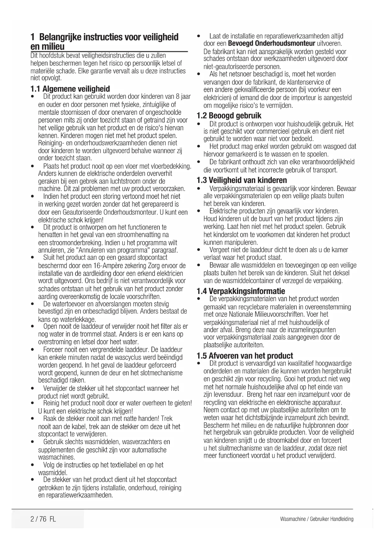 User’s Manual2 / 76 FL Wasmachine / Gebruiker Handleiding 1 Belangrijke instructies voor veiligheid