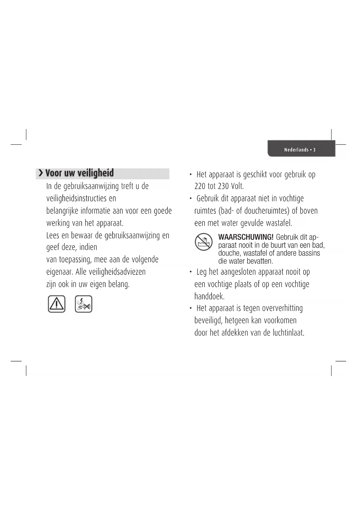 - Het apparaat is tegen oververhitting beveiligd, hetgeen kan voorkomen door het afdekken van de luchtinlaat. WAARSCHUWING! Gebruik dit ap- paraat nooit in de buurt van een bad, douche, wastafel of andere bassins die water bevatten.4 • Nederlands In dit geval schakelt het apparaat zich automatisch uit en dient u de schakelaar op de 0 stand te plaatsen en 6 minuten te wachten voordat u het apparaat weer in gebruik gaat nemen.