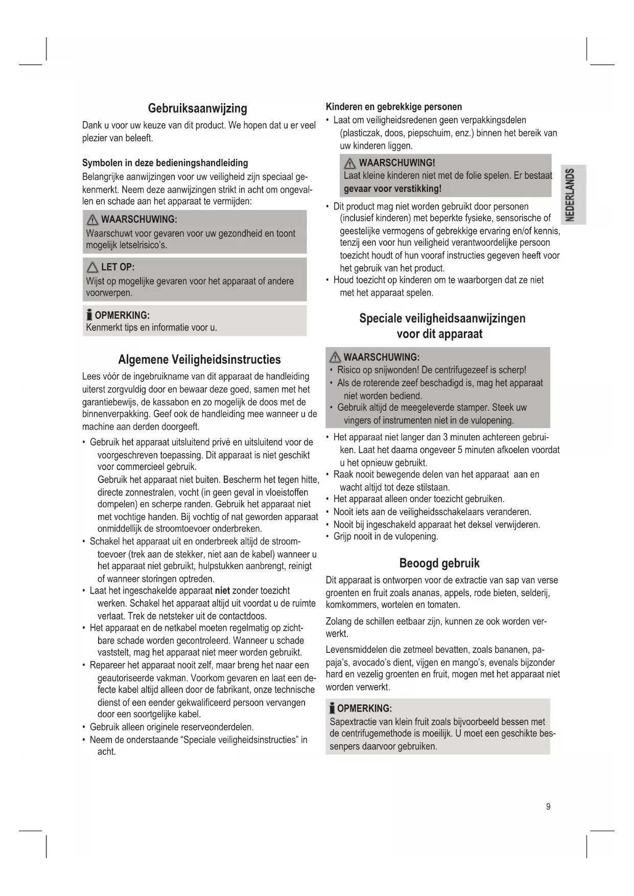- Neem de onderstaande “Speciale veiligheidsinstructies” in acht. Kinderen en gebrekkige personen