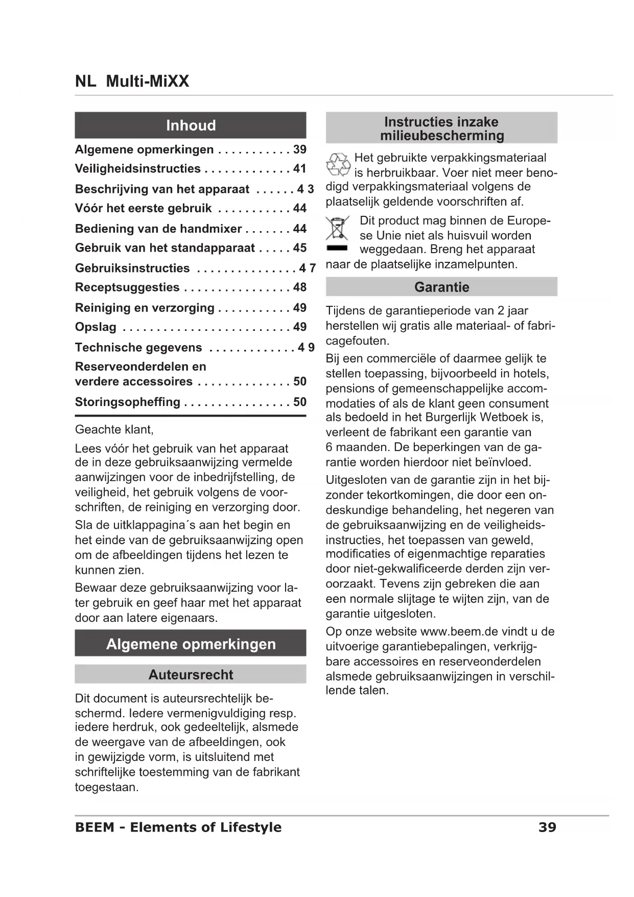 - Numérotation suivant la description de l’appareil Dépannage Le tableau suivant aide à localiser les petites perturbations et à y remédier : Erreur Cause possible Remède Après actionnement du bouton de réglage de la vitesse, l'appareil ne fonc- tionne pas. Fiche non branchée. Brancher la che. Coupe-circuit non actionné dans la distribution électrique. Mettre en marche le coupe-circuit automati- que. L’interrupteur de sécurité interne a arrêté l’appareil pour cause de surchauffe. Laisser l’appareil refroi- dir. Le coupe-circuit a sauté dans la distribution élec- trique. Trop d’appareils raccordés au même circuit électrique. Réduire le nombre des appareils dans le circuit électrique. Aucune panne visible. Informer le service Après-vente. Le moteur tourne visible- ment de manière lente ou il se bloque Pâte trop lourde. Rajouter du liquide. REMARQUE Si vous ne réussissez pas à résoudre le problème avec les actions précitées, ► veuillez vous adresser au service Après-vente.39 NL Multi-MiXX BEEM - Elements of Lifestyle Geachte klant, Lees vóór het gebruik van het apparaat de in deze gebruiksaanwijzing vermelde aanwijzingen voor de inbedrijfstelling, de veiligheid, het gebruik volgens de voor- schriften, de reiniging en verzorging door. Sla de uitklappagina´s aan het begin en het einde van de gebruiksaanwijzing open om de afbeeldingen tijdens het lezen te kunnen zien. Bewaar deze gebruiksaanwijzing voor la- ter gebruik en geef haar met het apparaat door aan latere eigenaars. Algemene opmerkingen Auteursrecht Dit document is auteursrechtelijk be- schermd. Iedere vermenigvuldiging resp. iedere herdruk, ook gedeeltelijk, alsmede de weergave van de afbeeldingen, ook in gewijzigde vorm, is uitsluitend met schriftelijke toestemming van de fabrikant toegestaan. Instructies inzake milieubescherming Het gebruikte verpakkingsmateriaal is herbruikbaar. Voer niet meer beno- digd verpakkingsmateriaal volgens de plaatselijk geldende voorschriften af. Dit product mag binnen de Europe- se Unie niet als huisvuil worden weggedaan. Breng het apparaat naar de plaatselijke inzamelpunten. Garantie Tijdens de garantieperiode van 2 jaar herstellen wij gratis alle materiaal- of fabri- cagefouten. Bij een commerciële of daarmee gelijk te stellen toepassing, bijvoorbeeld in hotels, pensions of gemeenschappelijke accom- modaties of als de klant geen consument als bedoeld in het Burgerlijk Wetboek is, verleent de fabrikant een garantie van 6 maanden. De beperkingen van de ga- rantie worden hierdoor niet beïnvloed. Uitgesloten van de garantie zijn in het bij- zonder tekortkomingen, die door een on- deskundige behandeling, het negeren van de gebruiksaanwijzing en de veiligheids- instructies, het toepassen van geweld, modicaties of eigenmachtige reparaties door niet-gekwaliceerde derden zijn ver- oorzaakt. Tevens zijn gebreken die aan een normale slijtage te wijten zijn, van de garantie uitgesloten. Op onze website www.beem.de vindt u de uitvoerige garantiebepalingen, verkrijg- bare accessoires en reserveonderdelen alsmede gebruiksaanwijzingen in verschil- lende talen. Algemene opmerkingen . . . . . . . . . . . 39 Veiligheidsinstructies . . . . . . . . . . . . . 41 Beschrijving van het apparaat ......43 Vóór het eerste gebruik . . . . . . . . . . . 44 Bediening van de handmixer . . . . . . . 44 Gebruik van het standapparaat . . . . . 45 Gebruiksinstructies ...............47 Receptsuggesties . . . . . . . . . . . . . . . . 48 Reiniging en verzorging . . . . . . . . . . . 49 Opslag . . . . . . . . . . . . . . . . . . . . . . . . . 49 Technische gegevens .............49 Reserveonderdelen en verdere accessoires . . . . . . . . . . . . . . 50 Storingsophefng . . . . . . . . . . . . . . . . 50 Inhoud40 Multi-MiXX NL BEEM - Elements of Lifestyle WAARSCHUWING In geval van oneigenlijk gebruik en/ of niet voorzien gebruik van het appa- raat kunnen van het apparaat gevaren uitgaan. Het apparaat mag uitsluitend voor ► het beoogde, toegelaten gebruiks- doel worden gebruikt. Leef de in deze gebruiksaanwijzing ► beschreven voorschriften na. Claims en reclamaties van welke aard dan ook, die te herleiden zijn tot verkeerd of oneigenlijk gebruik, worden niet aanvaard. Het risico berust dan uitsluitend bij de ge- bruiker. Houd bij commercieel gebruik rekening met een wijziging van de garantieperiode. Aansprakelijkheidsbeperkingen Alle in deze gebruiksaanwijzing vermelde technische informatie, gegevens en in- structies voldoen aan de stand van zaken op het tijdstip van druk. Aan de vermeldingen, afbeeldingen en beschrijvingen in deze handleiding kunnen dan ook geen rechten worden ontleend. De fabrikant aanvaardt geen aanspra- kelijkheid voor schade die voortkomt uit het negeren van de gebruiksaanwijzing, gebruik in strijd met de voorschriften, ondeskundige reparaties, ongeoorloofd uitgevoerde modicaties of gebruik van niet-toegelaten reserveonderdelen en/of verbruiksmaterialen. Conformiteitsverklaring Bij deze verklaart BEEM dat dit apparaat aan de principiële eisen en de overige van toepassing zijnde bepalingen van de richt- lijn 2006/95/EG en 2004/108/EG voldoet. Een volledige conformiteitsverklaring vindt u op www.beem.de Gebruikte symbolen GEVAAR Wordt gebruikt voor een onmiddellijk dreigend gevaar dat ernstig of dodelijk lichamelijk letsel tot gevolg kan hebben. Ter voorkoming van het gevaar ► moeten de hier vermelde instructies worden nageleefd. WAARSCHUWING Wordt gebruikt voor een mogelijke ge- vaarlijke situatie die lichamelijke letsels zou kunnen veroorzaken. Ter voorkoming van het gevaar ► moeten de hier vermelde instructies worden nageleefd. LET OP Wordt gebruikt voor een mogelijke gevaarlijke situatie die materiële schade kan veroorzaken. Ter voorkoming van het gevaar ► moeten de hier vermelde instructies worden nageleefd. OPMERKING Een opmerking bevat verdere ► informatie die de omgang met het apparaat eenvoudiger kan maken. Gebruik volgens de voorschriften Dit appara
