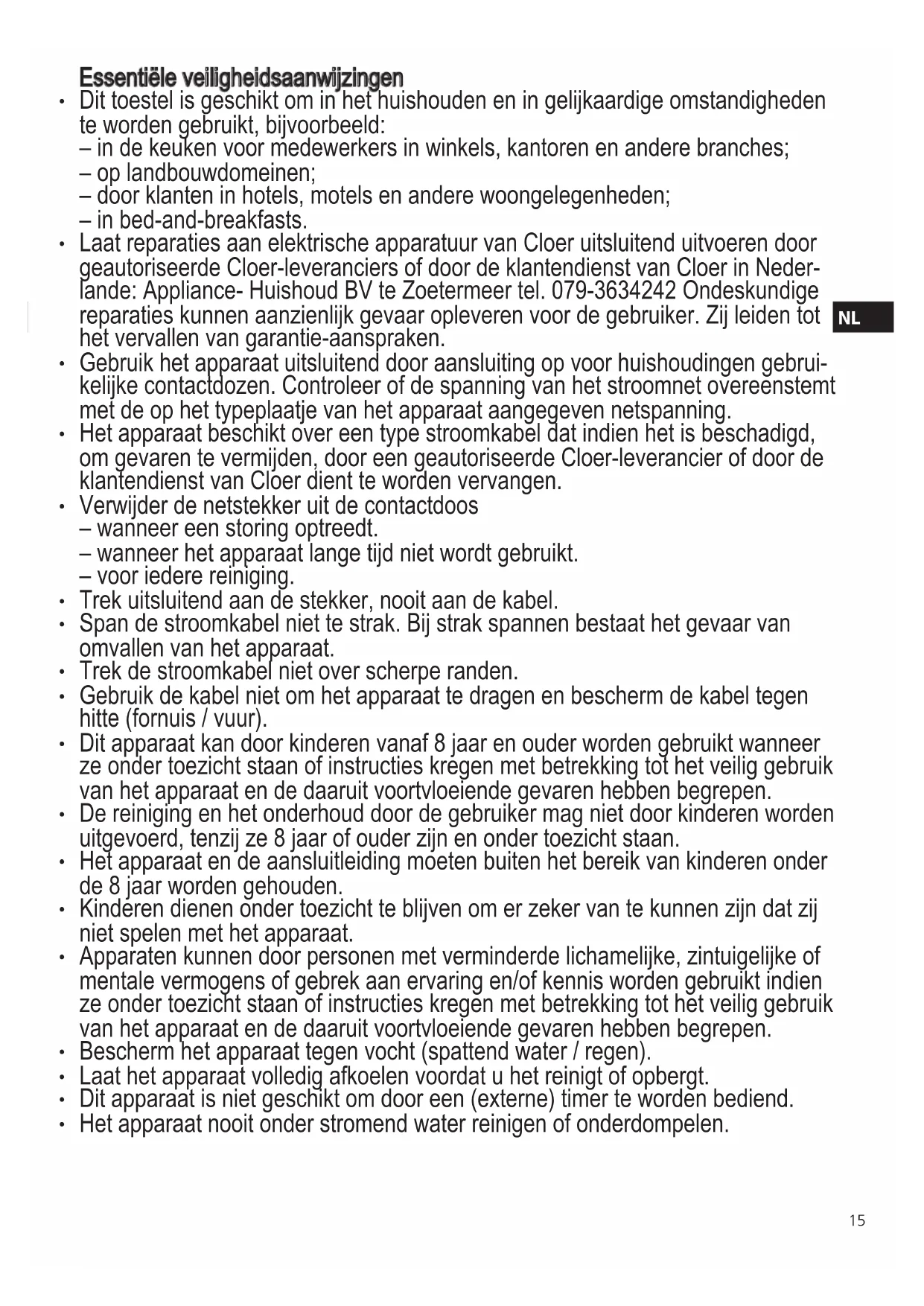 - Laat reparations aan elektrische apparatuur van Cloer uitsluitend uitvoeren door geauthoriseerde Cloer-leveranciers of door de klantendienst van Cloer in Nederlande: Appliance-Huishoud BV te Zoetermeer tel. 079-3634242 Ondeskundige reparations konnen aanzienlijk gevaar opleveren voor de gebruiker. Zij leiden tot het verzallen van garantie-aanspraken.