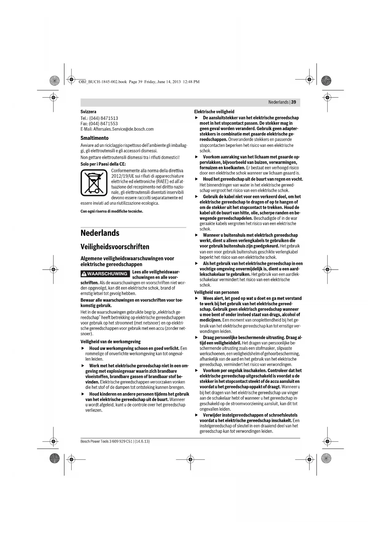 Rulli combinati in Vlies Per satinatura e opacizzazione di superfici metalliche fine 120 –240 Rulli in Vlies OBJ_BUCH-1845-002.book Page 38 Friday, June 14, 2013 12:48 PMNederlands | 39 Bosch Power Tools 3 609 929 C51 | (14.6.13) Svizzera Tel.: (044) 8471513 Fax: (044) 8471553 E-Mail: Aftersales.Service@de.bosch.com Smaltimento Avviare ad un riciclaggio rispettoso dell’ambiente gli imballag- gi, gli elettroutensili e gli accessori dismessi. Non gettare elettroutensili dismessi tra i rifiuti domestici! Solo per i Paesi della CE: Conformemente alla norma della direttiva 2012/19/UE sui rifiuti di apparecchiature elettriche ed elettroniche (RAEE) ed all’at- tuazione del recepimento nel diritto nazio- nale, gli elettroutensili diventati inservibili devono essere raccolti separatamente ed essere inviati ad una riutilizzazione ecologica. Con ogni riserva di modifiche tecniche. Nederlands Veiligheidsvoorschriften Algemene veiligheidswaarschuwingen voor elektrische gereedschappen Lees alle veiligheidswaar- schuwingen en alle voor- schriften. Als de waarschuwingen en voorschriften niet wor- den opgevolgd, kan dit een elektrische schok, brand of ernstig letsel tot gevolg hebben. Bewaar alle waarschuwingen en voorschriften voor toe- komstig gebruik. Het in de waarschuwingen gebruikte begrip „elektrisch ge- reedschap” heeft betrekking op elektrische gereedschappen voor gebruik op het stroomnet (met netsnoer) en op elektri- sche gereedschappen voor gebruik met een accu (zonder net- snoer). Veiligheid van de werkomgeving Houd uw werkomgeving schoon en goed verlicht. Een rommelige of onverlichte werkomgeving kan tot ongeval- len leiden. Werk met het elektrische gereedschap niet in een om- geving met explosiegevaar waarin zich brandbare vloeistoffen, brandbare gassen of brandbaar stof be- vinden. Elektrische gereedschappen veroorzaken vonken die het stof of de dampen tot ontsteking kunnen brengen. Houd kinderen en andere personen tijdens het gebruik van het elektrische gereedschap uit de buurt. Wanneer u wordt afgeleid, kunt u de controle over het gereedschap verliezen. Elektrische veiligheid De aansluitstekker van het elektrische gereedschap moet in het stopcontact passen. De stekker mag in geen geval worden veranderd. Gebruik geen adapter- stekkers in combinatie met geaarde elektrische ge- reedschappen. Onveranderde stekkers en passende stopcontacten beperken het risico van een elektrische schok. Voorkom aanraking van het lichaam met geaarde op- pervlakken, bijvoorbeeld van buizen, verwarmingen, fornuizen en koelkasten. Er bestaat een verhoogd risico door een elektrische schok wanneer uw lichaam geaard is. Houd het gereedschap uit de buurt van regen en vocht. Het binnendringen van water in het elektrische gereed- schap vergroot het risico van een elektrische schok. Gebruik de kabel niet voor een verkeerd doel, om het elektrische gereedschap te dragen of op te hangen of om de stekker uit het stopcontact te trekken. Houd de kabel uit de buurt van hitte, olie, scherpe randen en be- wegende gereedschapdelen. Beschadigde of in de war geraakte kabels vergroten het risico van een elektrische schok. Wanneer u buitenshuis met elektrisch gereedschap werkt, dient u alleen verlengkabels te gebruiken die voor gebruik buitenshuis zijn goedgekeurd. Het gebruik van een voor gebruik buitenshuis geschikte verlengkabel beperkt het risico van een elektrische schok. Als het gebruik van het elektrische gereedschap in een vochtige omgeving onvermijdelijk is, dient u een aard- lekschakelaar te gebruiken. Het gebruik van een aardlek- schakelaar vermindert het risico van een elektrische schok. Veiligheid van personen Wees alert, let goed op wat u doet en ga met verstand te werk bij het gebruik van het elektrische gereed- schap. Gebruik geen elektrisch gereedschap wanneer u moe bent of onder invloed staat van drugs, alcohol of medicijnen. Een moment van onoplettendheid bij het ge- bruik van het elektrische gereedschap kan tot ernstige ver- wondingen leiden. Draag persoonlijke beschermende uitrusting. Draag al- tijd een veiligheidsbril. Het dragen van persoonlijke be- schermende uitrusting zoals een stofmasker, slipvaste werkschoenen, een veiligheidshelm of gehoorbescherming, afhankelijk van de aard en het gebruik van het elektrische gereedschap, vermindert het risico van verwondingen. Voorkom per ongeluk inschakelen. Controleer dat het elektrische gereedschap uitgeschakeld is voordat u de stekker in het stopcontact steekt of de accu aansluit en voordat u het gereedschap oppakt of draagt. Wanneer u bij het dragen van het elektrische gereedschap uw vinger aan de schakelaar hebt of wanneer u het gereedschap in- geschakeld op de stroomvoorziening aansluit, kan dit tot ongevallen leiden. Verwijder instelgereedschappen of schroefsleutels voordat u het elektrische gereedschap inschakelt. Een instelgereedschap of sleutel in een draaiend deel van het gereedschap kan tot verwondingen leiden. WAARSCHUWING OBJ_BUCH-1845-002.book Page 39 Friday, June 14, 2013 12:48 PM40 | Nederlands 3 609 929 C51 | (14.6.13) Bosch Power Tools Voorkom een onevenwichtige lichaamshouding. Zorg ervoor dat u stevig staat en steeds in evenwicht blijft. Daardoor kunt u het elektrische gereedschap in onver- wachte situaties beter onder controle houden. Draag geschikte kleding. Draag geen loshangende kle- ding of sieraden. Houd haren, kleding en handschoe- nen uit de buurt van bewegende delen. Loshangende kleding, lange haren en sieraden kunnen door bewegende delen worden meegenomen. Wanneer stofafzuigings- of stofopvangvoorzieningen kunnen worden gemonteerd, dient u zich ervan te ver- zekeren dat deze zijn aangesloten en juist worden ge- bruikt. Het gebruik van een stofafzuiging beperkt het ge- vaar door stof. Zorgvuldige omgang met en zorgvuldig gebruik van elek- trische gereedschappen Overbelast het gereedschap niet. Gebruik voor uw werkzaamheden het daarvoor bestemde elektrische gereedschap. Met het passende elektrische gereedschap werkt u beter en veil