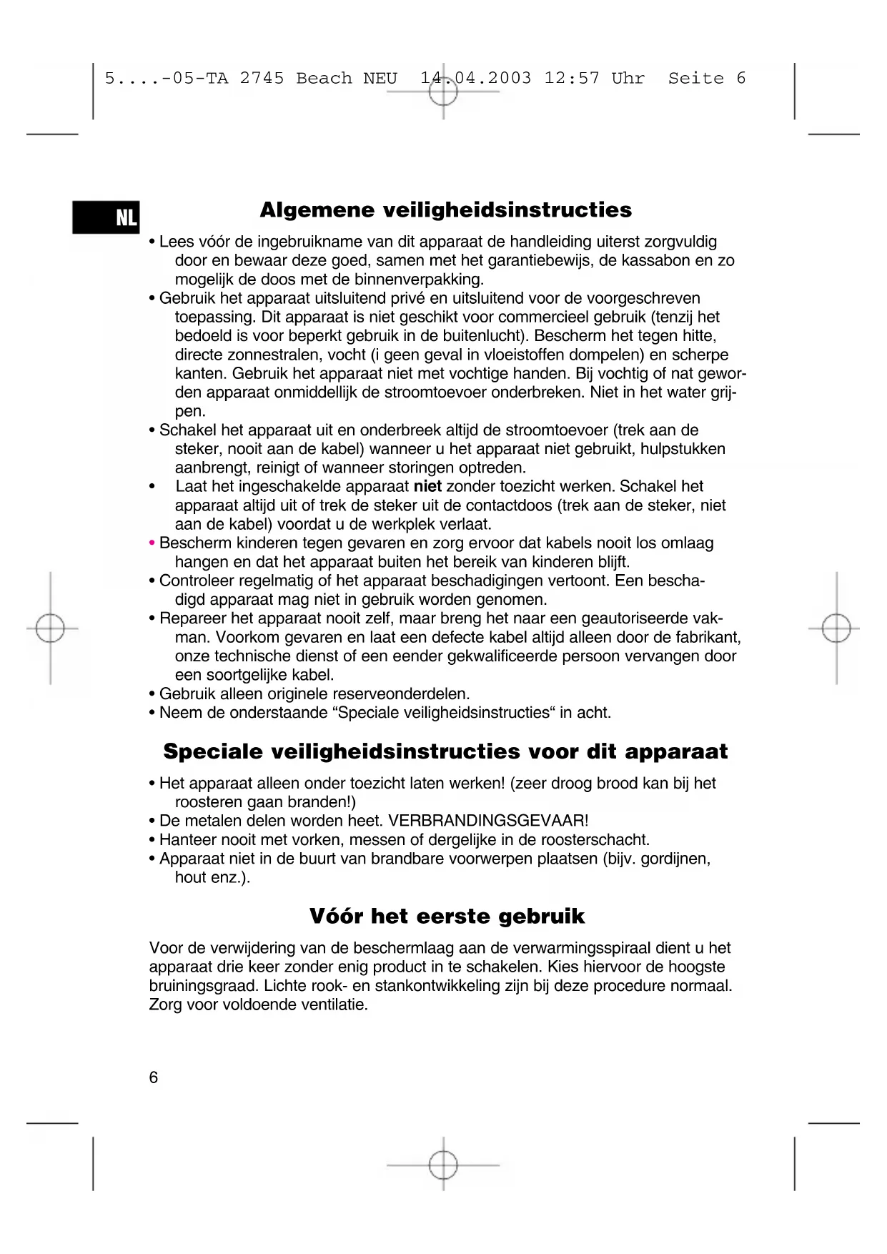 Voor de verwijdering van de beschermlaag aan de verwarmingsspiraal dient u het apparaat drie keer zonder enig product in te schakelen. Kies hiervoorde hoogste bruiningsgraad. Lichte rook- en stankontwikkeling+zijn bij deze procedure normala. Zorg voor voldoende ventilatie.