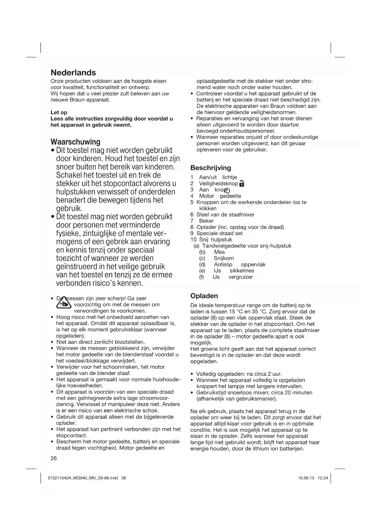 in de beker om zo te serveren. Alternatief: Meng eerst het fruit in de beker met het sikkelmes (10b), maximaal tot 0,5 liter vullen. Verwijder het sikkelmes en plaats de ijs vergruizer in de beker om het ijs direct in het gepureerde fruit te vergruizen. Schoonmaken Verwijder voor het schoonmaken het motorgedeelte. Dompel het motorgedeelte (4), batterij (8) niet onder water. Deze delen kunnen alleen schoon worden gemaakt met een vochtig doekje. Het snij-hulpstuk (10a) is niet vaatwasmachinebe- stendig. Alle andere onderdelen zijn vaatwas- machinebestendig. Bij het snijden van gekleurd voedsel (bijvoorbeeld wortels) kunnen de plastic onderdelen verkleuren. Veeg deze onderdelen af met plantaardige olie voordat u ze in de vaatwasser doet. Voor elektrische specificaties, kijk op de stekker van de oplader. Deze draad past zich automatisch aan elke wereldwijde voltage aan. Onderwerp te veranderen zonder opmerking Deze applicatie bevat Li-Ion oplaadbare batterijen. Gooi dit apparaat aan het eind van zijn nuttige levensduur niet bij het huisafval. Lever deze in bij een Braun service center of bij de door uw gemeente aanwezigen inleveradressen. 5722110424_MQ940_MN_S6-88.indd 285722110424_MQ940_MN_S6-88.indd 28 10.06.13 12:2410.06.13 12:2429 Dansk Vores produkter er skabt til at opfylde de største krav med hensyn til kvalitet, funktionalitet og design. Vi håber, at du vil få stor glæde af dit nye apparat fra Braun. Læs hele brugervejledningen omhyggeligt, før apparatet tages i brug. NB!
