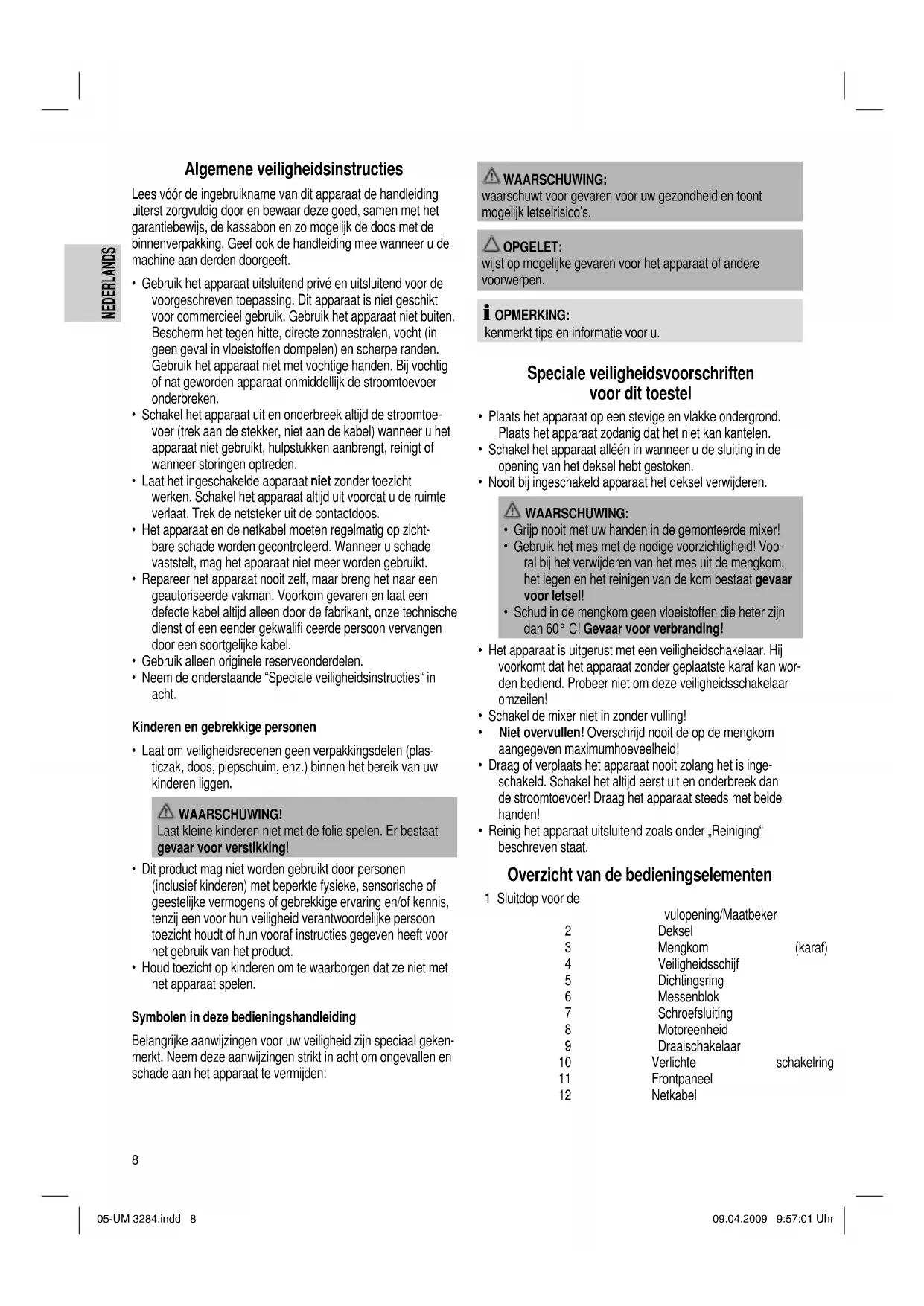 - Reinig het apparaat uitsluitend zoals onder „Reiniging“ beschreven staat. Overzicht van de bedieningselementen 1 Sluitdop voor de vulopening/Maatbeker 2 Deksel 3 Mengkom (karaf) 4 Veiligheidsschijf 5 Dichtingsring 6 Messenblok 7 Schroefsluiting 8 Motoreenheid 9 Draaischakelaar 10 Verlichte schakelring 11 Frontpaneel 12 Netkabel 05-UM 3284.indd 805-UM 3284.indd 8 09.04.2009 9:57:01 Uhr09.04.2009 9:57:01 Uhr9 NEDERLANDS NEDERLANDS Montage Netkabel Neem de netkabel uit het opbergvak in het bodemelement. Mengkom