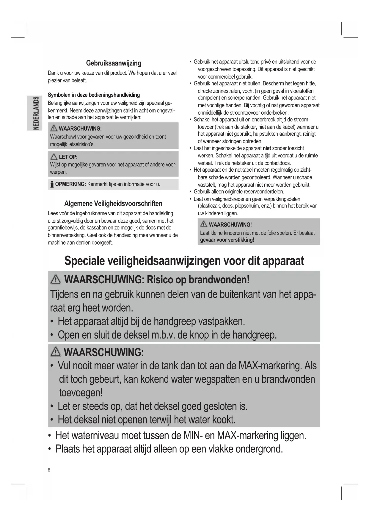 - Het apparaat altijd uitschakelen voordat u de ketel van de basis verwijdert! Zorg er vook voor dat het apparaat is uitgeschakeld als u het apparaat terug zet op de basis! WAARSCHUWING: Gevaar voor verbranding!