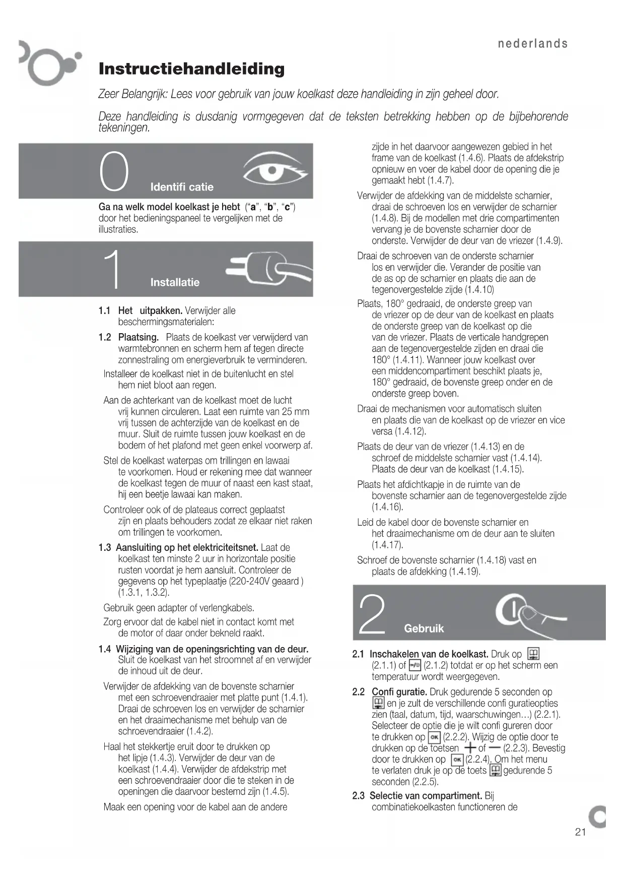 Instructiehandleiding Zeer Belangrijk: Lees voor gebruik van jouw koelkast deze handleiding in zijn geheel door. Deze handleiding is dusdanig vormgegeven dat de teksten betrekking hebben op de bijbehorende tekeningen. Installatie Ga na welk model koelkast je hebt (“a”, “b”, “c”) door het bedieningspaneel te vergelijken met de illustraties.