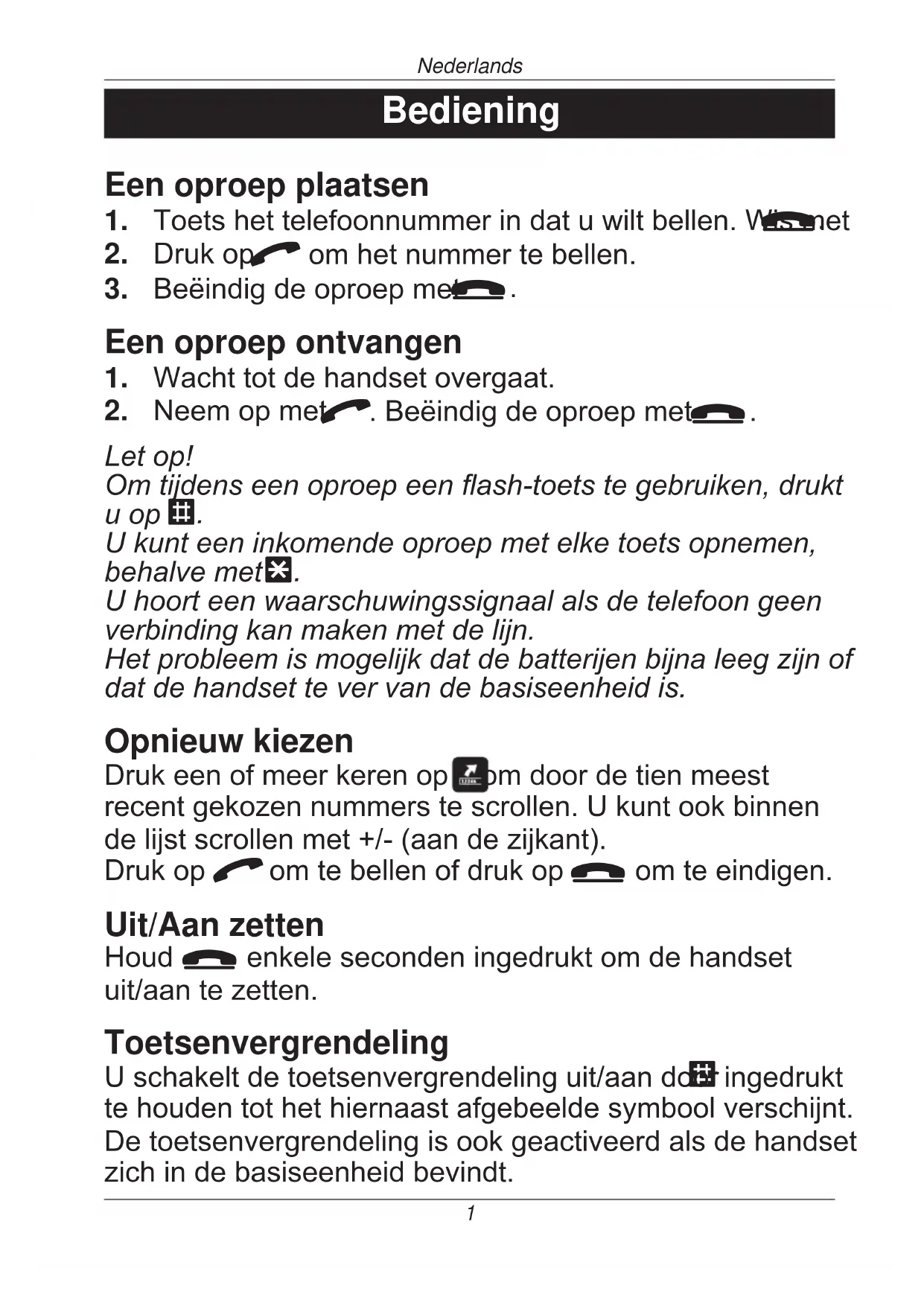 U hoort een waarschuwingssignaal als de telefoon geen verbinding kan maken met de lijn. Het probleem is mogelijk dat de batterijen bijna leeg zijn of dat de handset te ver van de basiseenheid is. Opnieuw kiezen Drukeenofmeerkerenop omdoordetienmeest recentgekozennummerstescrollen.Ukuntookbinnen delijstscrollenmet+/-(aandezijkant). Drukop