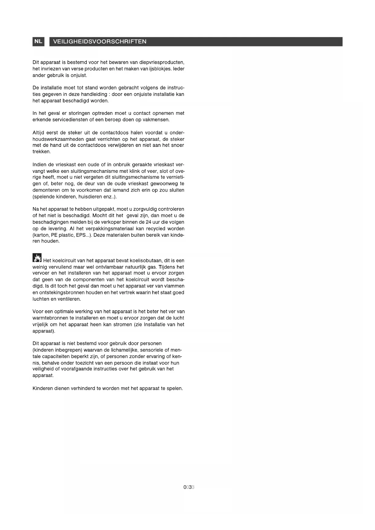 TTEECCHHNNIISSCCHHEE SSEERRVVIICCEEDDIIEENNSSTT Indien u alle hierboven staande controles hebt uitgevoerd en de storing niet is verdwenen, MAG U NIET ZELF GAAN SLEUTELEN AAN DE VRIESKAST. Neem contact op met de Technische Servicedienst bij u in de buurt.