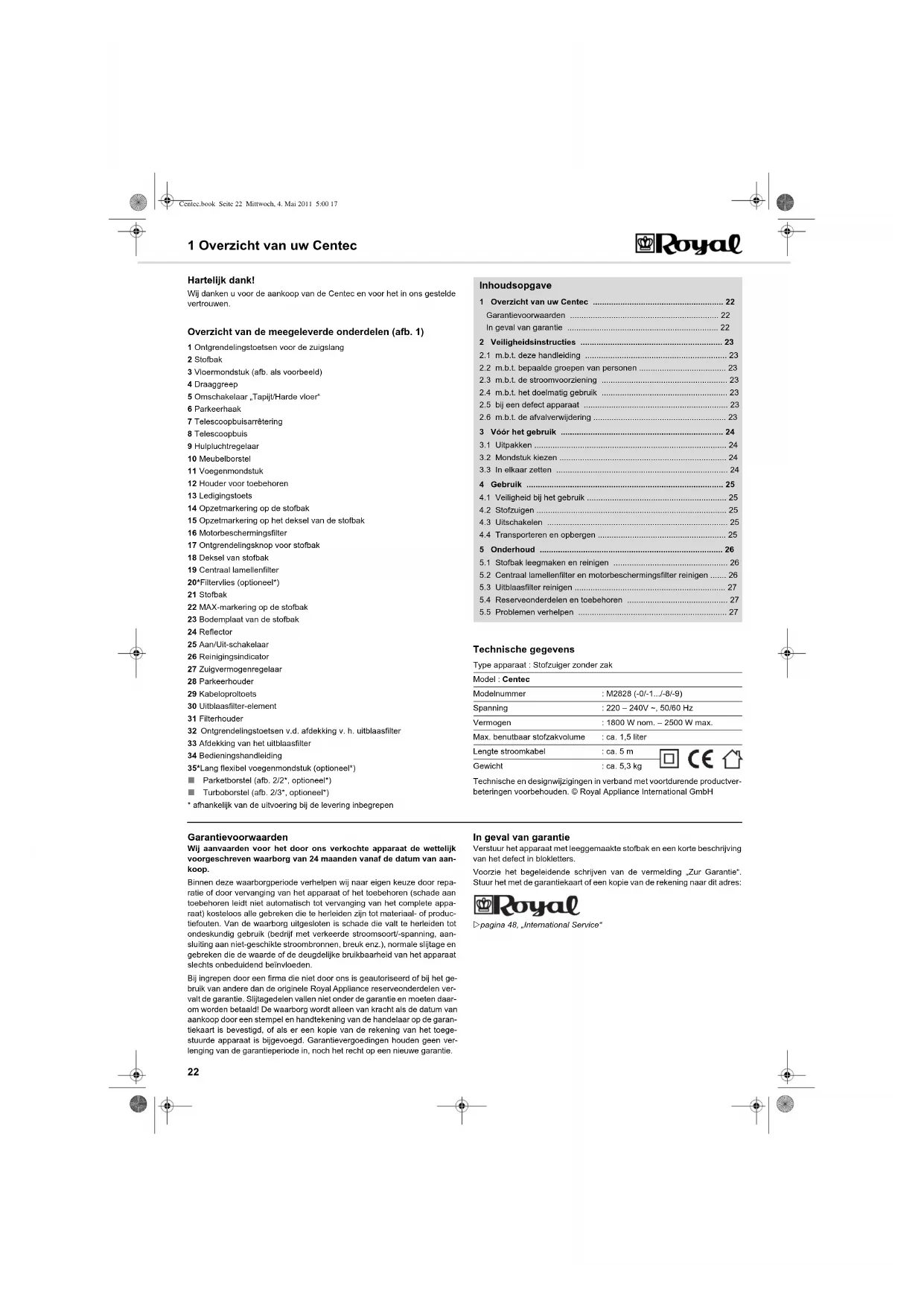 OPGELET: Het uitblaasfilterelement is niet wasbaar. OPGELET: Gebruik alleen originele reserveonderdelen die bij de levering inbegre-pen zijn of die u door nabestelling heeft bijgekocht.Artikelnr. Beschrijving2828001 5-delige filterset, bestaande uit 1 centrale lamellenfilter, 1 motorbeschermingsfilter, 1 uitblaasfilter + 2 viltvliezenM203 1 parketborstelM209 1 turboborstelM232 1 lang flexibel voegenmondstuk WAARSCHUWING: Verwondingsgevaar! Gebruik nooit een defect apparaat! Voordat u pro-blemen gaat opsporen schakelt u het apparaat uit en trekt u de stekker uit het stopcontact, Zhoofdstuk 4.3, „Uitschakelen“. Probleem Mogelijke oorzaak / OplossingApparaat kan niet aangezet worden.Stopcontact heeft geen stroom. Test de stofzuiger aan een ander stopcontact, waarvan u zeker weet dat er stroom op staat.Stroomkabel is beschadigd.Laat de stroomkabel vervangen door de Royal Appliance klantenservice, adres Zpagina 48, „International Service“. Apparaat stopt plot-seling met zuigen.De oververhittingsbeveiliging is geactiveerd (eventueel van-wege verstopte aanzuigwegen e.d.). Schakel het apparaat uit en trek de stekker uit het stopcon-tact. Verwijder de oorzaak van de oververhitting (b.v. telescoopbuis en zuigslang demonteren en verstop-ping verwijderen). Wacht ca. 45 minuten. Het afgekoelde apparaat kunt u nu weer inschakelen.Reinigingsindicator (afb. 1/26) is verlicht.Centrale lamellenfilter is vervuild. Reinig het centrale lamellenfilter, Zhoofdstuk 5.2, „Centraal lamellenfilter en motorbeschermingsfilter reinigen“. Stofbak is te vol. Maak de stofbak leeg/schoon, Zhoofdstuk 5.1, „Stofbak leegmaken en reinigen“.Zuigresul-taat is on-danks een optimale functie niet naar tevre-denheid.Hulpluchtregelaar (afb. 1/9) is geopend.Sluit de hulpluchtregelaar.Aangebracht mondstuk is niet geschikt. Vervang het mondstuk, Zhoofdstuk 3.2, „Mondstuk kiezen“. Ingesteld zuigvermogen is niet geschikt.Pas de stand van de zuigvermogenregelaar aan het vloer aan, Zhoofdstuk 4.2, „Stofzuigen“, stap 4. Stand van de omschakelaar „Tapijt/Harde vloer“ (afb. 1/5) is niet juist.Pas de stand van de omschakelaar „Tapijt/Harde vloer“ aan de bedekking aan, Zhoofdstuk 4.2, „Stofzuigen“, stap 5. Stofbak is te vol.Maak de stofbak leeg/schoon, Zhoofdstuk 5.1, „Stofbak leegmaken en reinigen“.Filters zijn vervuild. Reinig het betreffende filter, Zhoofdstuk 5.2, „Centraal la- mellenfilter en motorbeschermingsfilter reinigen“ resp. Zhoofdstuk 5.3, „Uitblaasfilter reinigen“.Mondstuk, telescoopbuis of zuigslang zijn verstopt.Verwijder de verstopping. Gebruik hiervoor zo nodig een lange houten stok (b.v. een bezemsteel). AANWIJZING: Als u het probleem met behulp van deze tabel niet kunt verhelpen, neem dan contact op met de Royal Appliance klantenservice (Zpagina 48, „International Service“).Probleem Mogelijke oorzaak / OplossingCentec.book Seite 27 Mittwoch, 4. Mai 2011 5:00 1728