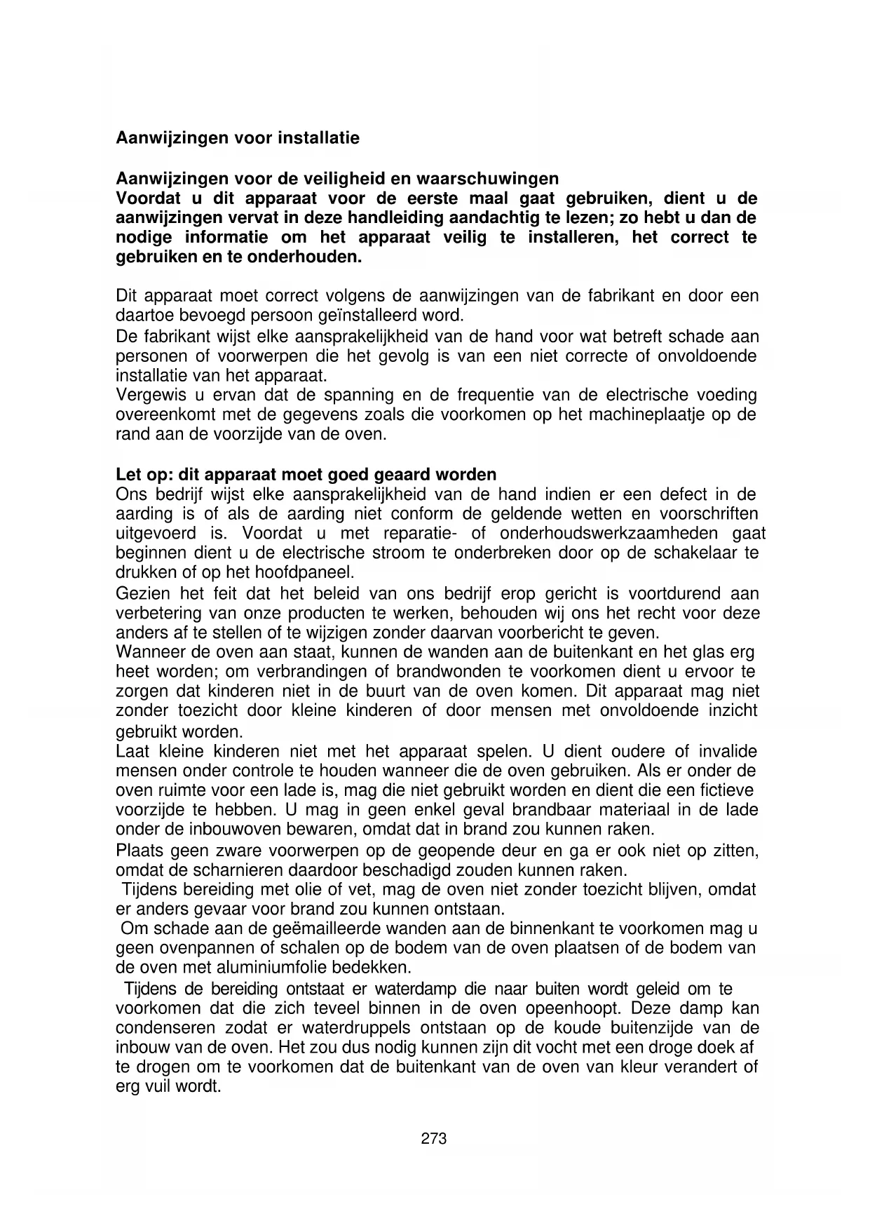 Данные функции должны использоваться для деликатных и/или предварительно нагретых продуктов питания. Можно готовить одно и то же блюдо на различных уровнях (время приготовления остаётся таким же). 271Aanwijzingen voor installatie Aanwijzingen voor de veiligheid en waarschuwingen Voordat u dit apparaat voor de eerste maal gaat gebruiken, dient u de aanwijzingen vervat in deze handleiding aandachtig te lezen; zo hebt u dan de nodige informatie om het apparaat veilig te installeren, het correct te gebruiken en te onderhouden. Dit apparaat moet correct volgens de aanwijzingen van de fabrikant en door een daartoe bevoegd persoon geïnstalleerd word. De fabrikant wijst elke aansprakelijkheid van de hand voor wat betreft schade aan personen of voorwerpen die het gevolg is van een niet correcte of onvoldoende installatie van het apparaat. Vergewis u ervan dat de spanning en de frequentie van de electrische voeding overeenkomt met de gegevens zoals die voorkomen op het machineplaatje op de rand aan de voorzijde van de oven. Let op: dit apparaat moet goed geaard worden Ons bedrijf wijst elke aansprakelijkheid van de hand indien er een defect in de aarding is of als de aarding niet conform de geldende wetten en voorschriften uitgevoerd is. Voordat u met reparatie- of onderhoudswerkzaamheden gaat beginnen dient u de electrische stroom te onderbreken door op de schakelaar te drukken of op het hoofdpaneel. Gezien het feit dat het beleid van ons bedrijf erop gericht is voortdurend aan verbetering van onze producten te werken, behouden wij ons het recht voor deze anders af te stellen of te wijzigen zonder daarvan voorbericht te geven. Wanneer de oven aan staat, kunnen de wanden aan de buitenkant en het glas erg heet worden; om verbrandingen of brandwonden te voorkomen dient u ervoor te zorgen dat kinderen niet in de buurt van de oven komen. Dit apparaat mag niet zonder toezicht door kleine kinderen of door mensen met onvoldoende inzicht gebruikt worden. Laat kleine kinderen niet met het apparaat spelen. U dient oudere of invalide mensen onder controle te houden wanneer die de oven gebruiken. Als er onder de oven ruimte voor een lade is, mag die niet gebruikt worden en dient die een fictieve voorzijde te hebben. U mag in geen enkel geval brandbaar materiaal in de lade onder de inbouwoven bewaren, omdat dat in brand zou kunnen raken. Plaats geen zware voorwerpen op de geopende deur en ga er ook niet op zitten, omdat de scharnieren daardoor beschadigd zouden kunnen raken. Tijdens bereiding met olie of vet, mag de oven niet zonder toezicht blijven, omdat er anders gevaar voor brand zou kunnen ontstaan. Om schade aan de geëmailleerde wanden aan de binnenkant te voorkomen mag u geen ovenpannen of schalen op de bodem van de oven plaatsen of de bodem van de oven met aluminiumfolie bedekken. Tijdens de bereiding ontstaat er waterdamp die naar buiten wordt geleid om te voorkomen dat die zich teveel binnen in de oven opeenhoopt. Deze damp kan condenseren zodat er waterdruppels ontstaan op de koude buitenzijde van de inbouw van de oven. Het zou dus nodig kunnen zijn dit vocht met een droge doek af te drogen om te voorkomen dat de buitenkant van de oven van kleur verandert of erg vuil wordt. 273Alvorens de oven voor de eerste maal te gaan gebruiken Zet, voordat u het apparaat gaat schoonmaken, het apparaat uit door op de wandschakelaar te drukken of haal de stekker uit het stopcontact. Verwijder al het verpakkingsmateriaal en de de accessoires uit de oven. Maak de wandenvan de oven met een sopje met neutraal schoonmaakmiddel schoon. Verwijder de sopresten zorgvuldig met een vochtige doek. Was alle roosters en accessoires in de afwasmachine of in een warm sopje met een neutraal schoonmaakmiddel en droog ze daarna zorgvuldig af. Technische gegevens Dit apparaat is conform aan de EG-Richtlijnen 72/23, 93/68 en 89/336. Spanningsnormen ≈ 220-240 V fase + neutraal.