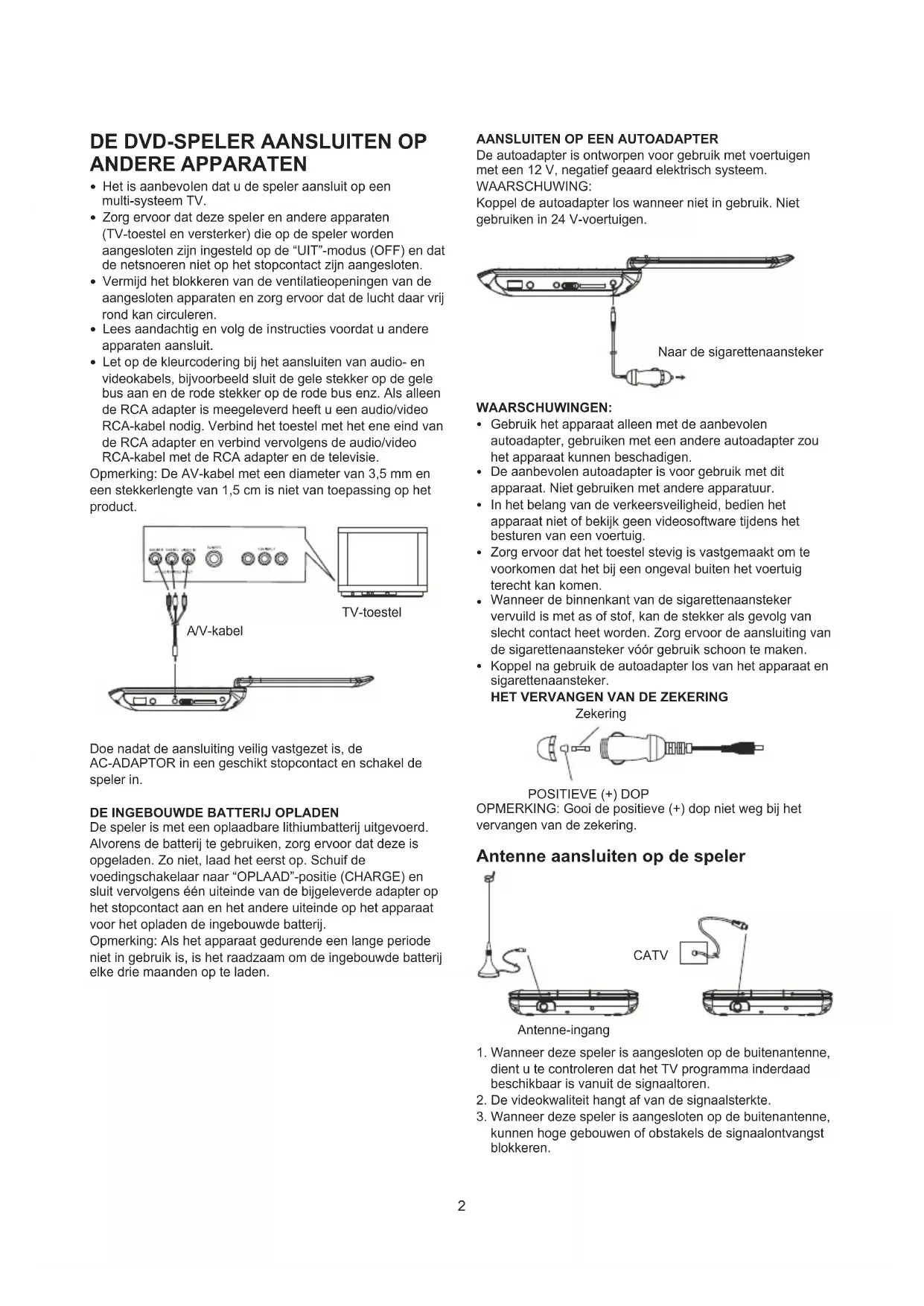 - Gebruik het apparaat alleen met de aanbevolen autoadapter, gebruiken met een andere autoadapter zou het apparaat konnen beschadigen.