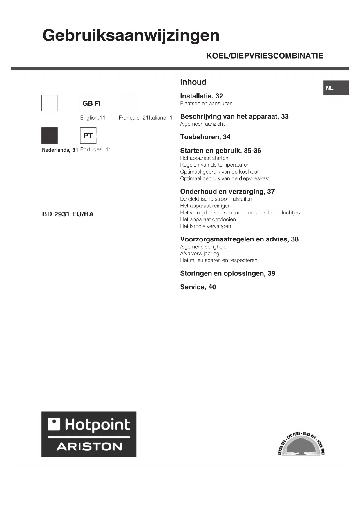 BD 2931 EUHA - Koelkast HOTPOINT - Gratis gebruiksaanwijzing en handleiding