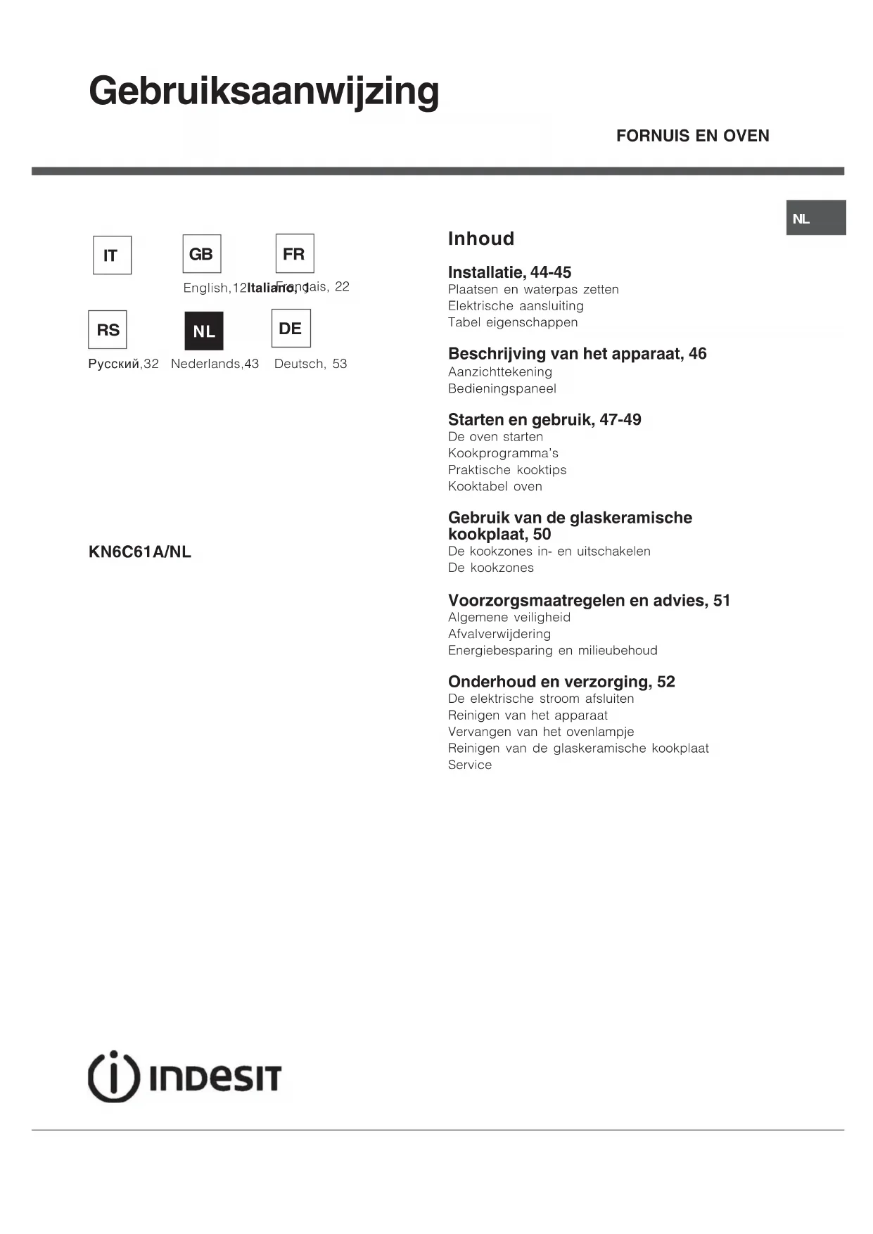 KN6C61A(X)NL - Fornuis INDESIT - Gratis gebruiksaanwijzing en handleiding