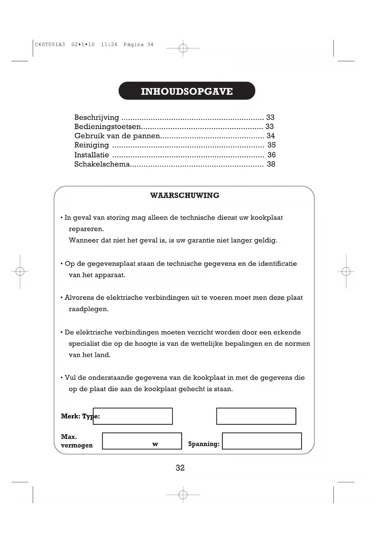 • Vul de onderstaande gegevens van de kookplaat in met de gegevens die