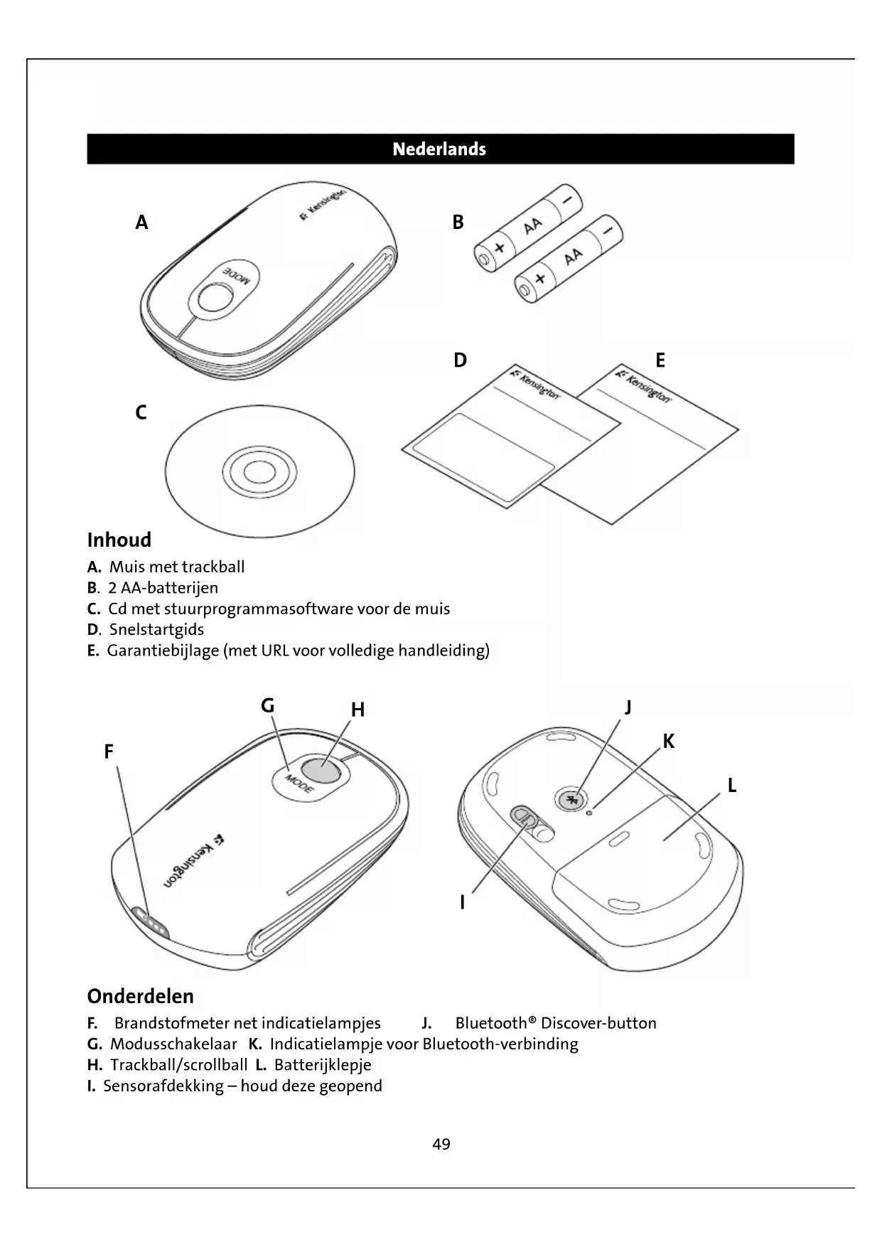 Kensington verklaart dat dit product voldoet aan de essentiële vereisten en overige relevante bepalingen van toepassing zijnde EC-richtlijnen. In Europa is de conformiteitsverklaring voor dit product verkrijgbaar via de koppeling ‘Compliance Documentation’ op www.support.kensington.com. INFORMATIE UITSLUITEND VOOR LIDSTATEN VAN DE EU Het gebruik van het pictogram geeft aan dat dit product niet als huishoudelijk afval mag worden. Door dit product op de juiste wijze weg te werpen, helpt u het voorkomen van mogelijke negatieve gevolgen voor het milieu en de volksgezondheid, die anders mogelijk worden veroorzaakt door een onjuiste afvalverwerking van dit product. Neem voor meer gedetailleerde informatie over het recyclen va dit product contact op met de afvalverwerking in uw plaats, de dienst voor verwerking van huishoudelijk afval of de winkel waar u dit product hebt aangeschaft. Kensington en ACCO zijn gedeponeerde handelsmerken van ACCO Brands. SlimBlade is een handelsmerk van ACCO Brands. The Kensington Promise is een servicemerk van ACCO Brands. Alle andere handelsmerken zijn eigendom van hun respectieve eigenaars. Patentaanvragen ingediend. © 2007 Kensington Computer Products Group, a division of ACCO Brands. Elke ongeautoriseerde vorm van kopiëren, dupliceren en reproductie anderszins is verboden als hiervoor geen schriftelijke toestemming is verleend door Kensington Computer Products Group. Alle rechten voorbehouden. 4/0765 Italiano A B Contenuto A. Mouse con trackball B. 2 batterie AA C. CD del driver del mouse D. Guida di riferimento rapido E. Inserto della garanzia (indica l’URL per il manuale di istruzioni completo) Componenti F. Spie dello stato di carica J. Pulsante di rilevamento Bluetooth® G. Interruttore di modalità K. Spia di connessione Bluetooth H. Trackball/Rotellina di scorrimento L. Coperchio delle batterie