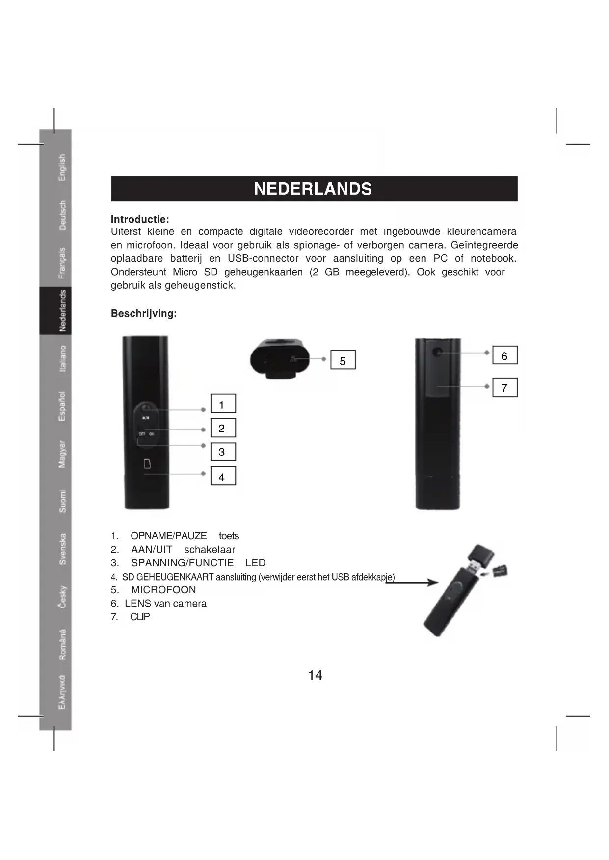 1. Verwijder het USB afdekkapje om de Micro SD geheugenkaart (4) te plaatsen. Steek