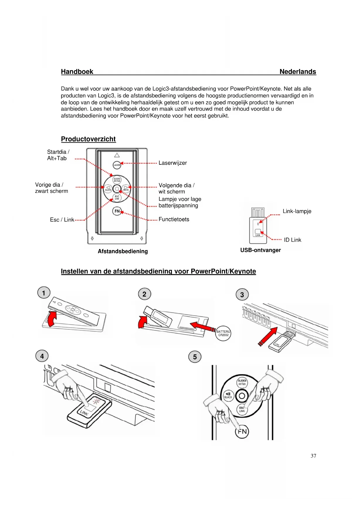 Laserwijzer Startdia / Alt+Tab Volgende dia / wit scherm Lampje voor lage batterijspanning Vorige dia / zwart scherm Functietoets Esc / Link Link-lampje ID Link USB-ontvanger Afstandsbediening BATTERIJ CR203238 Handboek Nederlands Instellen/Koppelen van de afstandsbediening voor PowerPoint/Keynote