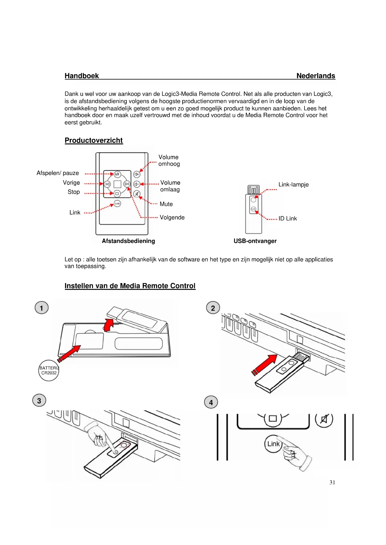 Afspelen/ pauze Volgende Vorige Link Stop Mute Volume omlaag Volume omhoog Link-lampje ID Link Afstandsbediening USB-ontvanger BATTERIJ CR203232 Handboek Nederlands Instellen/Koppelen van de Media Remote Control