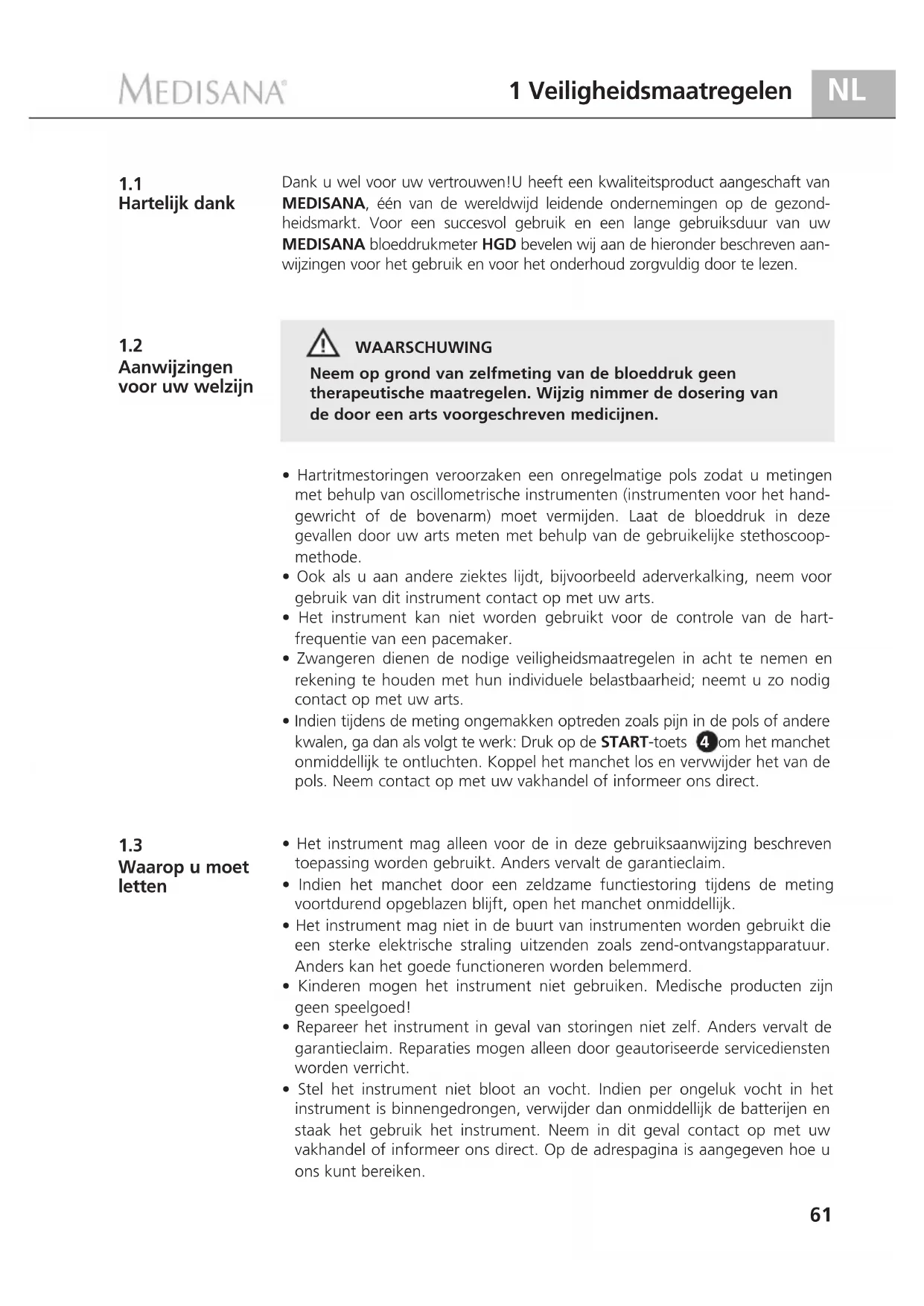 Aanwijzingen voor uw welzijn Dank u wel voor uw vertrouwen!U heeft een kwaliteitsproduct aangeschaft van MEDISANA, één van de wereldwijd leidende ondernemingen op de gezond- heidsmarkt. Voor een succesvol gebruik en een lange gebruiksduur van uw MEDISANA bloeddrukmeter HGD bevelen wij aan de hieronder beschreven aan- wijzingen voor het gebruik en voor het onderhoud zorgvuldig door te lezen. WAARSCHUWING Neem op grond van zelfmeting van de bloeddruk geen therapeutische maatregelen. Wijzig nimmer de dosering van de door een arts voorgeschreven medicijnen.