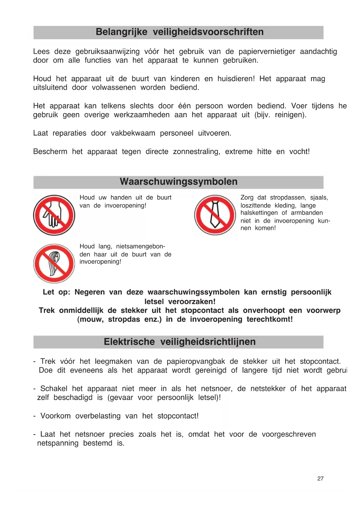 26Lees deze gebruiksaanwijzing vóór het gebruik van de papiervernietiger aandachtig