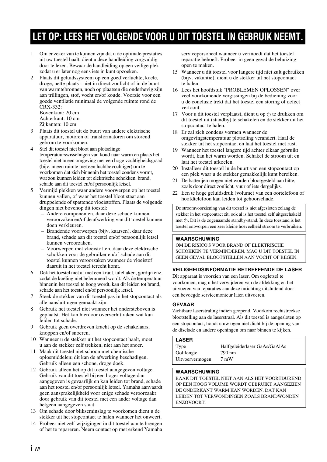 Dit apparaat is voorzien van een laser. Om oogletsel te voorkomen, mag u het verwijderen van de afdekking en het uitvoeren van reparaties aan deze inrichting uitsluitend door een bevoegde servicemonteur laten uitvoeren. GEVAAR Zichtbare laserstraling indien geopend. Voorkom rechtstreekse blootstelling aan de laserstraal. Als dit toestel is aangesloten op een stopcontact, houdt u uw ogen niet dicht bij de opening van de disclade en andere openingen om naar binnen te kijken. LASER Type Golflengte Uitvoervermogen Halfgeleiderlaser GaAs/GaAlAs 790 nm 7 mW WAARSCHUWING RAAK DIT TOESTEL NIET AAN ALS HET VOORTDUREND OP EEN HOOG VOLUME WORDT GEBRUIKT AANGEZIEN DE ONDERKANT WARM KAN WORDEN. DAT KAN