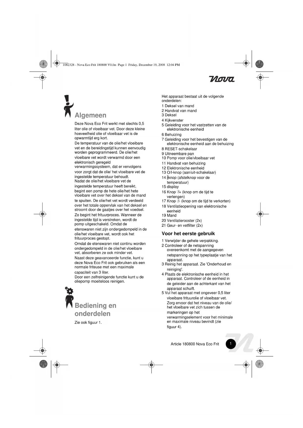 - Haal na gebruik altijd de stekker uit het stopcontact. 1082328 - Nova Eco Frit 180800 V0.fm Page 4 Friday, December 19, 2008 12:04 PM5 Article 180800 Nova Eco Frit