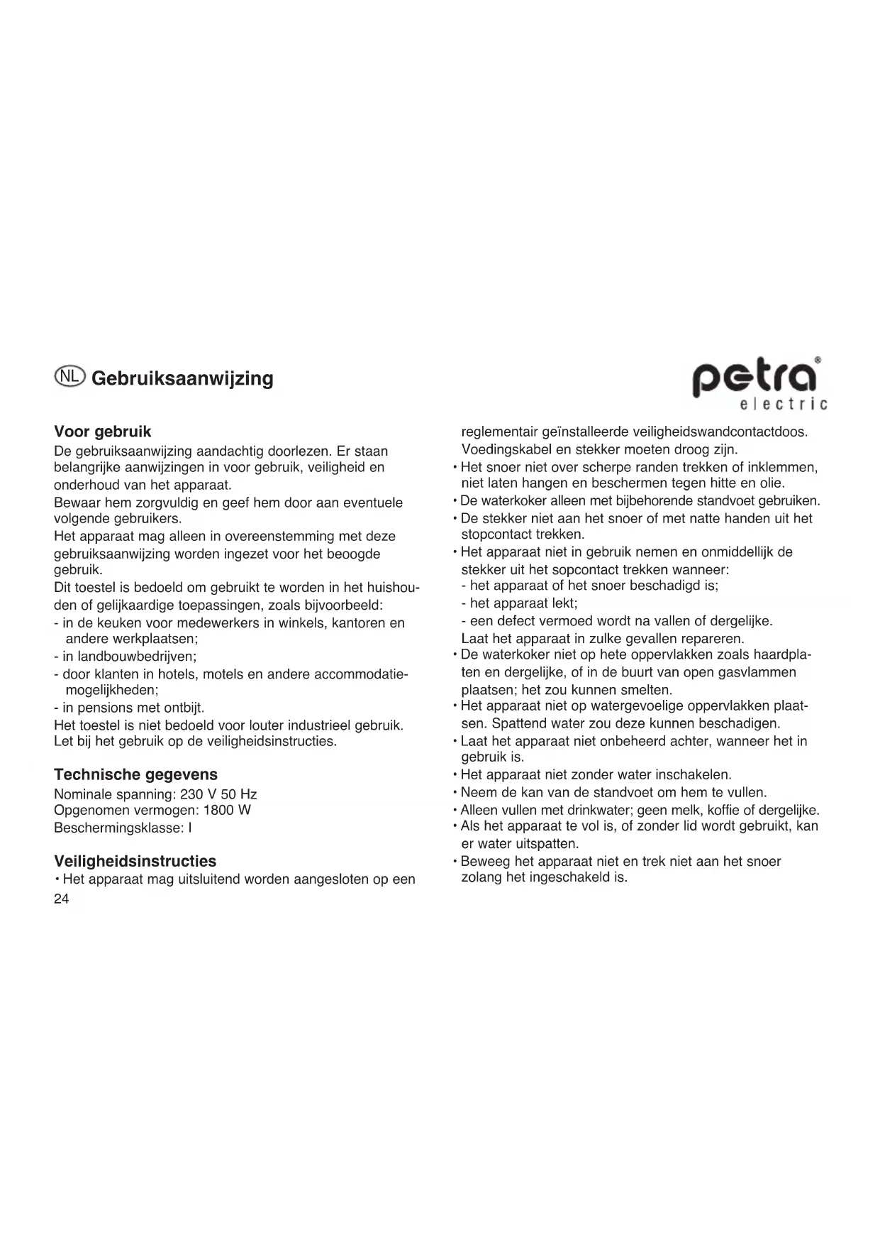 express está disponible en los comer- cios especializados o a través de petra electric en botellas de 500 ml..24 Voor gebruik De gebruiksaanwijzing aandachtig doorlezen. Er staan belangrijke aanwijzingen in voor gebruik, veiligheid en onderhoud van het apparaat. Bewaar hem zorgvuldig en geef hem door aan eventuele volgende gebruikers. Het apparaat mag alleen in overeenstemming met deze gebruiksaanwijzing worden ingezet voor het beoogde gebruik. Dit toestel is bedoeld om gebruikt te worden in het huishou- den of gelijkaardige toepassingen, zoals bijvoorbeeld: - in de keuken voor medewerkers in winkels, kantoren en andere werkplaatsen; - in landbouwbedrijven; - door klanten in hotels, motels en andere accommodatie- mogelijkheden; - in pensions met ontbijt. Het toestel is niet bedoeld voor louter industrieel gebruik. Let bij het gebruik op de veiligheidsinstructies. Technische gegevens Nominale spanning: 230 V 50 Hz Opgenomen vermogen: 1800 W Beschermingsklasse: I Veiligheidsinstructies