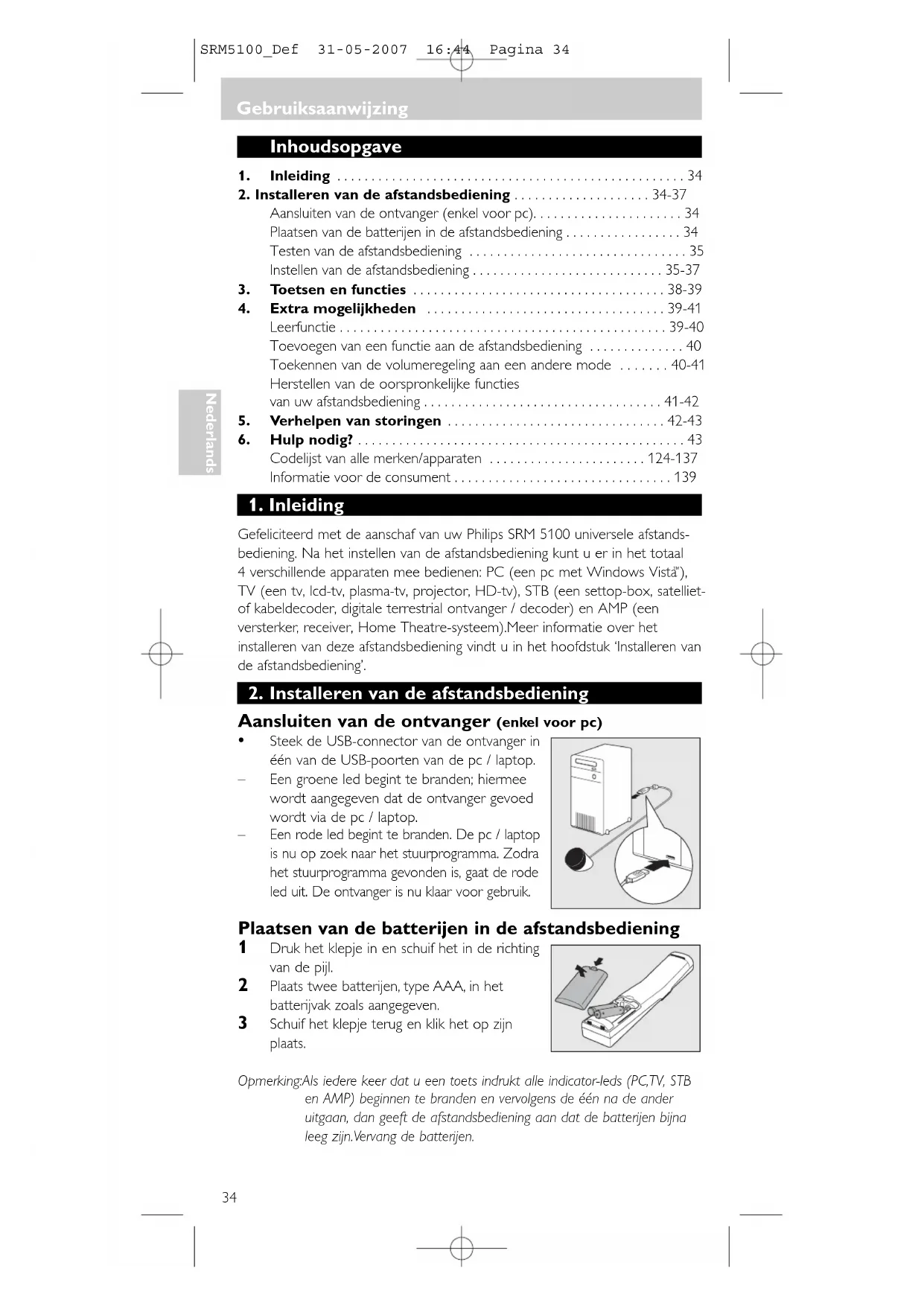 SRM5100_Def 31-05-2007 16:44 Pagina 34Testen van de afstandsbediening