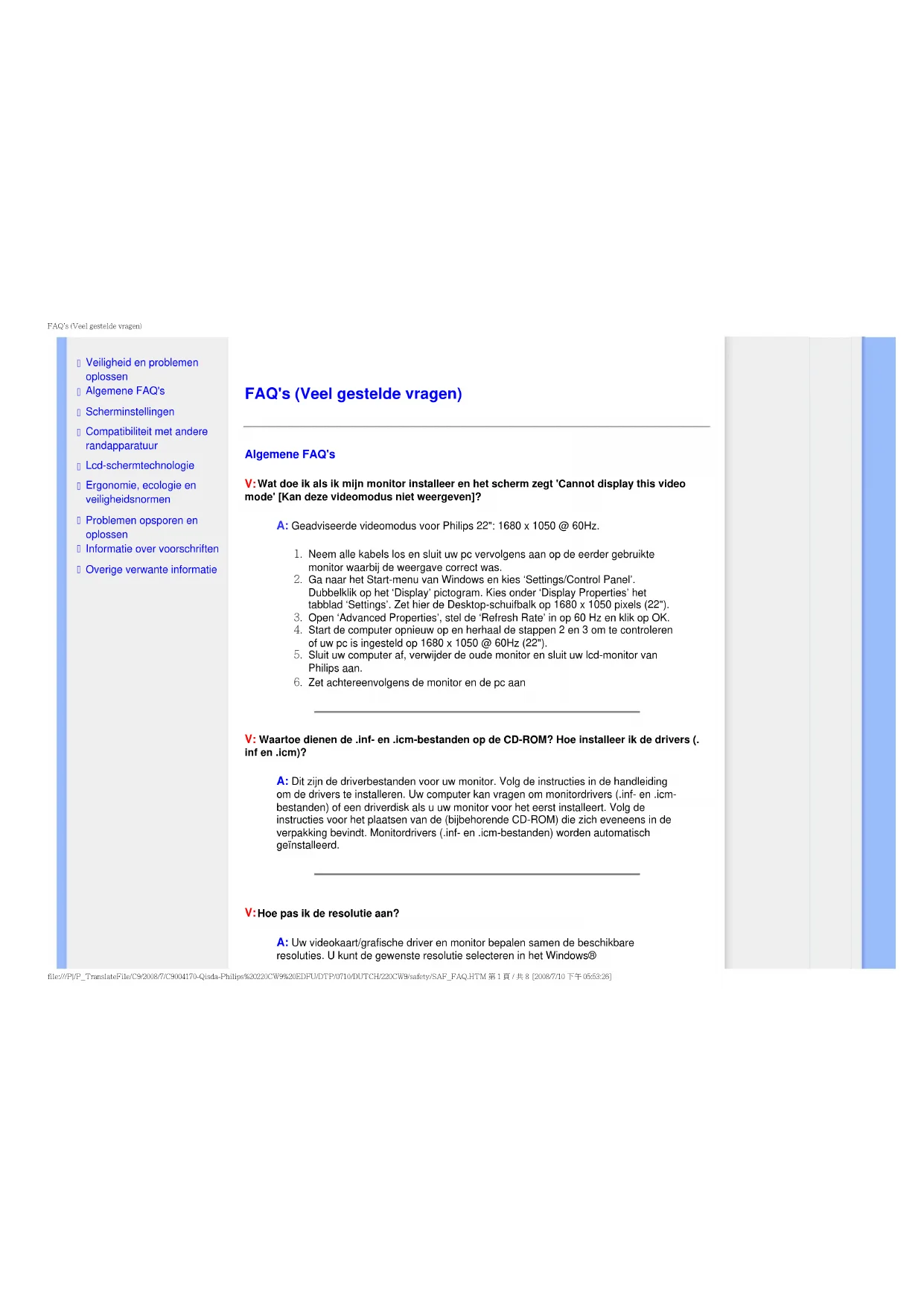 Wat doe ik als ik mijn monitor installeer en het scherm zegt 'Cannot display this video mode' [Kan deze videomodus niet weergeven]? A: Geadviseerde videomodus voor Philips 22": 1680 x 1050 @ 60Hz.