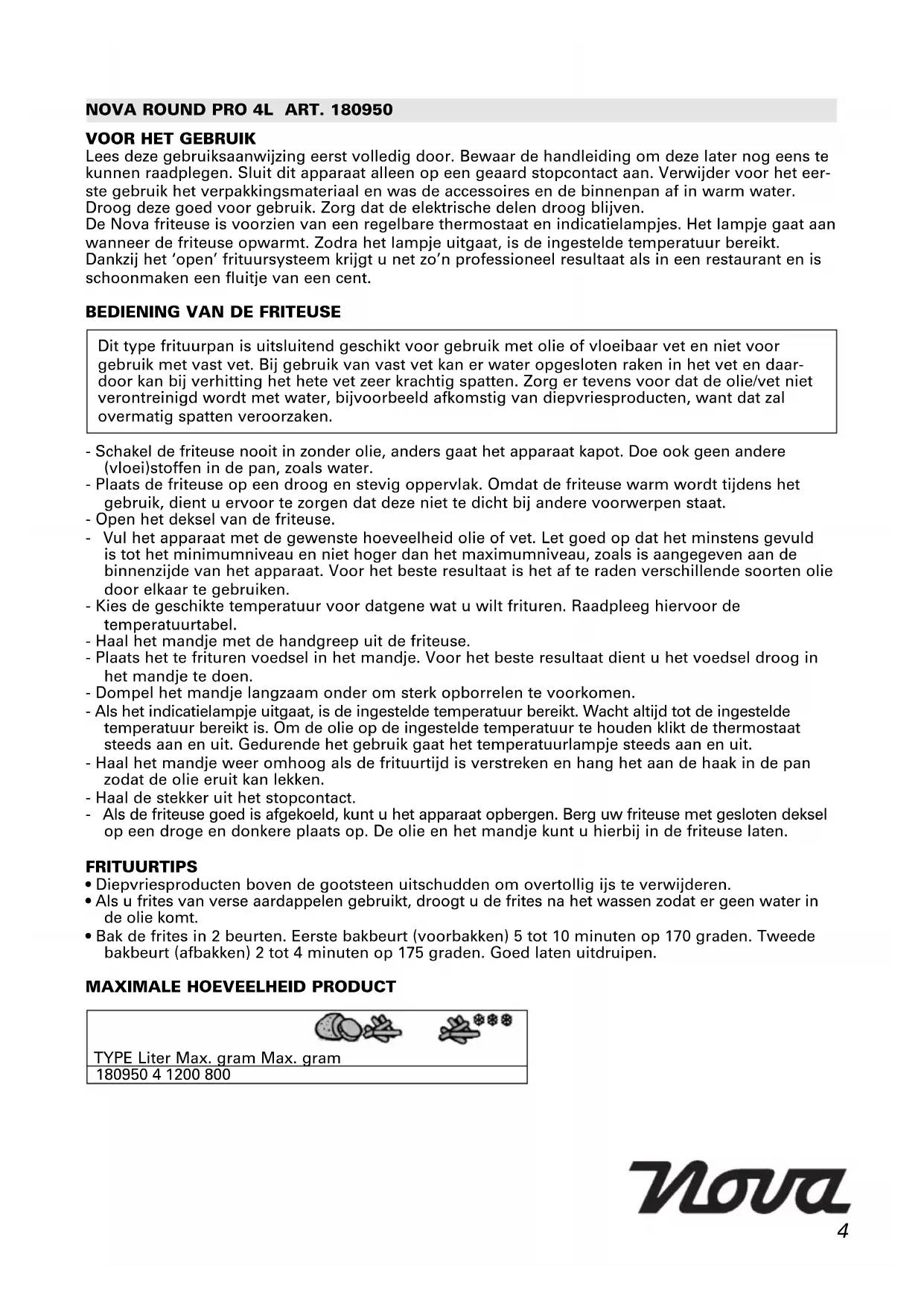 Lees deze gebruiksaanwijzing eerst volledig door. Bewaar de handleiding om deze later nog eens te kunnen raadplegen. Sluit dit apparaat alleen op een geaard stopcontact aan. Verwijder voor het eer- ste gebruik het verpakkingsmateriaal en was de accessoires en de binnenpan af in warm water. Droog deze goed voor gebruik. Zorg dat de elektrische delen droog blijven. De Nova friteuse is voorzien van een regelbare thermostaat en indicatielampjes. Het lampje gaat aan wanneer de friteuse opwarmt. Zodra het lampje uitgaat, is de ingestelde temperatuur bereikt. Dankzij het ‘open’ frituursysteem krijgt u net zo’n professioneel resultaat als in een restaurant en is schoonmaken een fluitje van een cent.