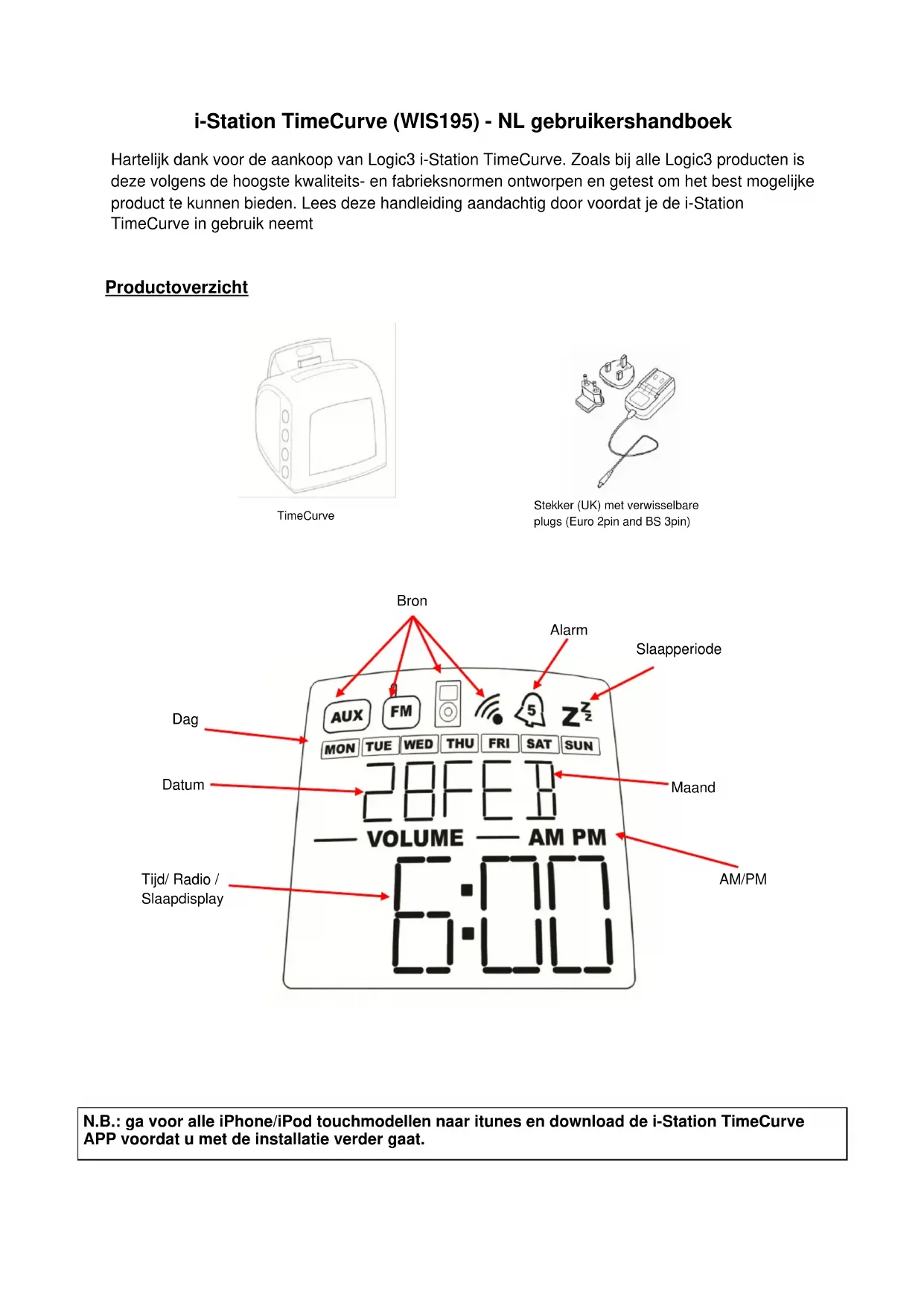 Bron Tijd/ Radio / Slaapdisplay AM/PM Datum Dag Alarm Maand Slaapperiode Stekker (UK) met verwisselbare plugs (Euro 2pin and BS 3pin) TimeCurve N.B.: ga voor alle iPhone/iPod touchmodellen naar itunes en download de i-Station TimeCurve APP voordat u met de installatie verder gaat.Instellen van de i-Station TimeCurve