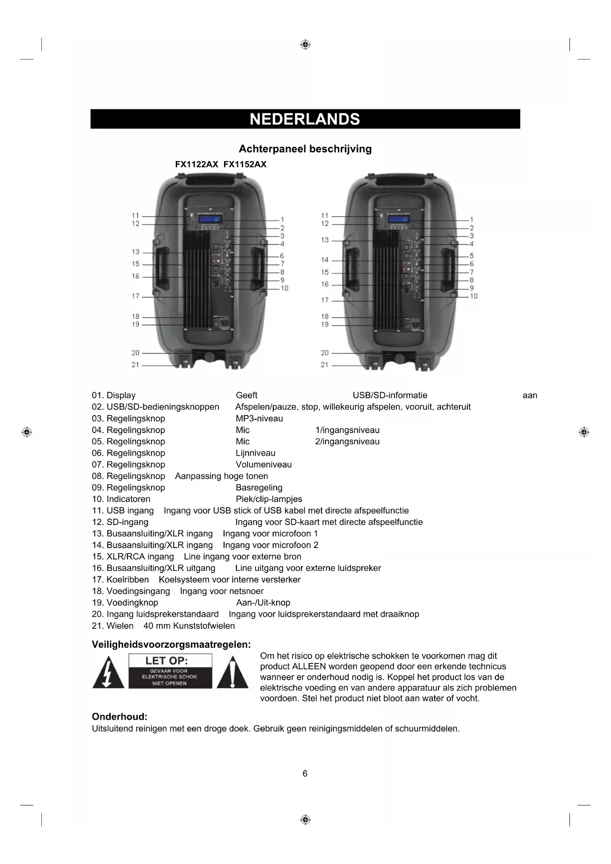 16. Busaansluiting/XLR uitgang Line uitgang voor externe luidspreker