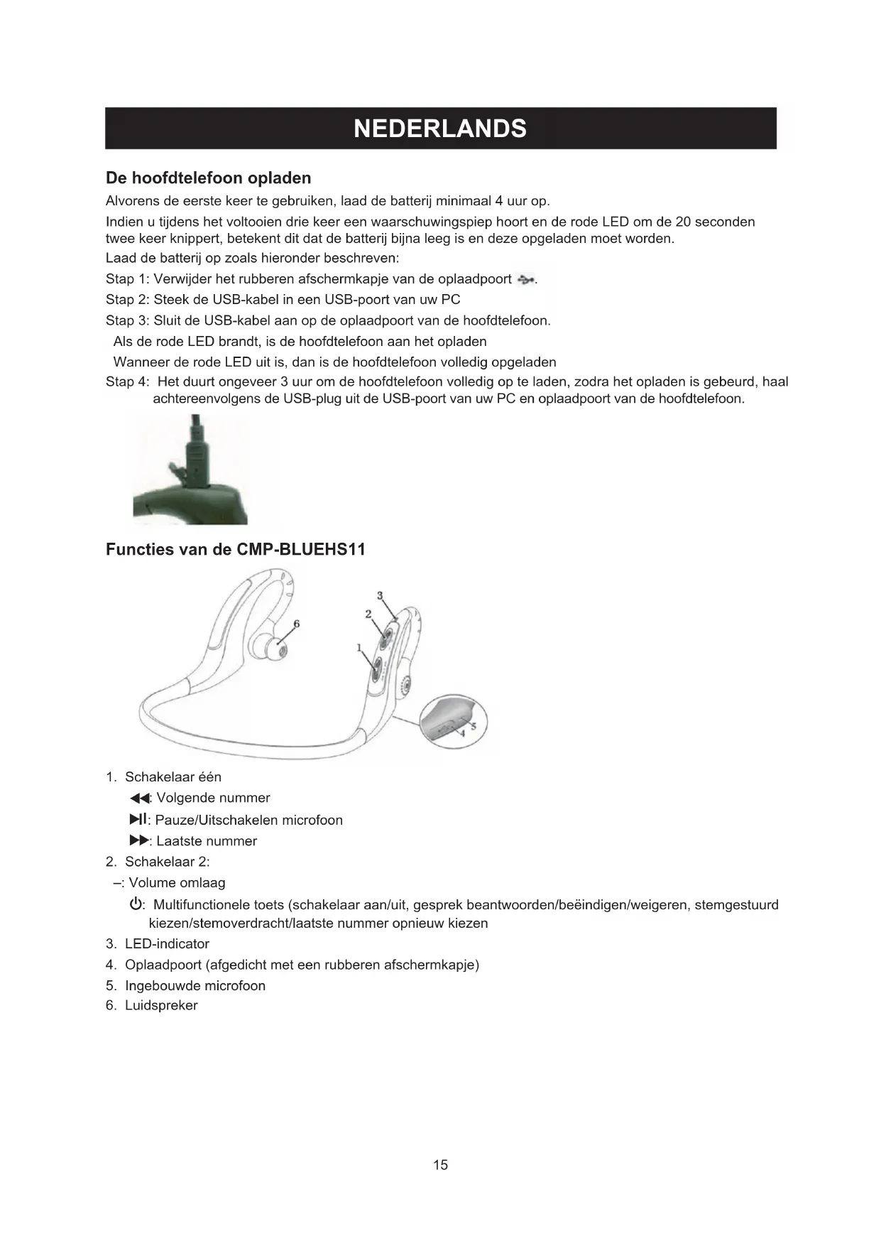 Stap 2: Steek de USB-kabel in een USB-poort van uw PC Stap 3: Sluit de USB-kabel aan op de oplaadpoort van de hoofdtelefoon. Als de rode LED brandt, is de hoofdtelefoon aan het opladen Wanneer de rode LED uit is, dan is de hoofdtelefoon volledig opgeladen Stap 4: Het duurt ongeveer 3 uur om de hoofdtelefoon volledig op te laden, zodra het opladen is gebeurd, haal achtereenvolgens de USB-plug uit de USB-poort van uw PC en oplaadpoort van de hoofdtelefoon. Functies van de CMP-BLUEHS11