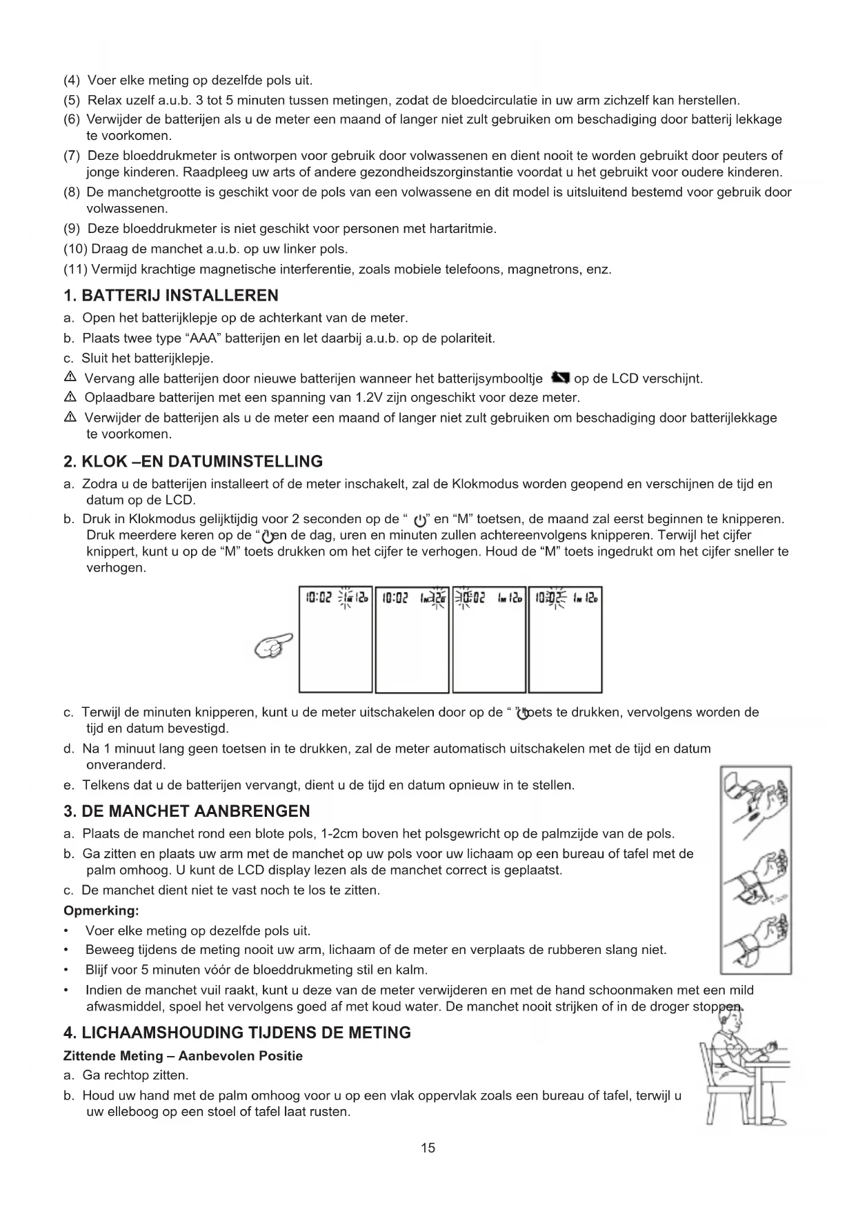(1) Ben stil, kalm en rust voor 5 minuten voordat u uw bloeddruk meet. (2) De manchet dient op dezelfde hoogte als uw hart te worden geplaatst. (3) Tijdens de meting dient u niet te praten of uw lichaam of arm te bewegen.15 (4) Voer elke meting op dezelfde pols uit. (5) Relax uzelf a.u.b. 3 tot 5 minuten tussen metingen, zodat de bloedcirculatie in uw arm zichzelf kan herstellen. (6) Verwijder de batterijen als u de meter een maand of langer niet zult gebruiken om beschadiging door batterij lekkage te voorkomen. (7) Deze bloeddrukmeter is ontworpen voor gebruik door volwassenen en dient nooit te worden gebruikt door peuters of jonge kinderen. Raadpleeg uw arts of andere gezondheidszorginstantie voordat u het gebruikt voor oudere kinderen. (8) De manchetgrootte is geschikt voor de pols van een volwassene en dit model is uitsluitend bestemd voor gebruik door volwassenen. (9) Deze bloeddrukmeter is niet geschikt voor personen met hartaritmie. (10) Draag de manchet a.u.b. op uw linker pols. (11) Vermijd krachtige magnetische interferentie, zoals mobiele telefoons, magnetrons, enz.