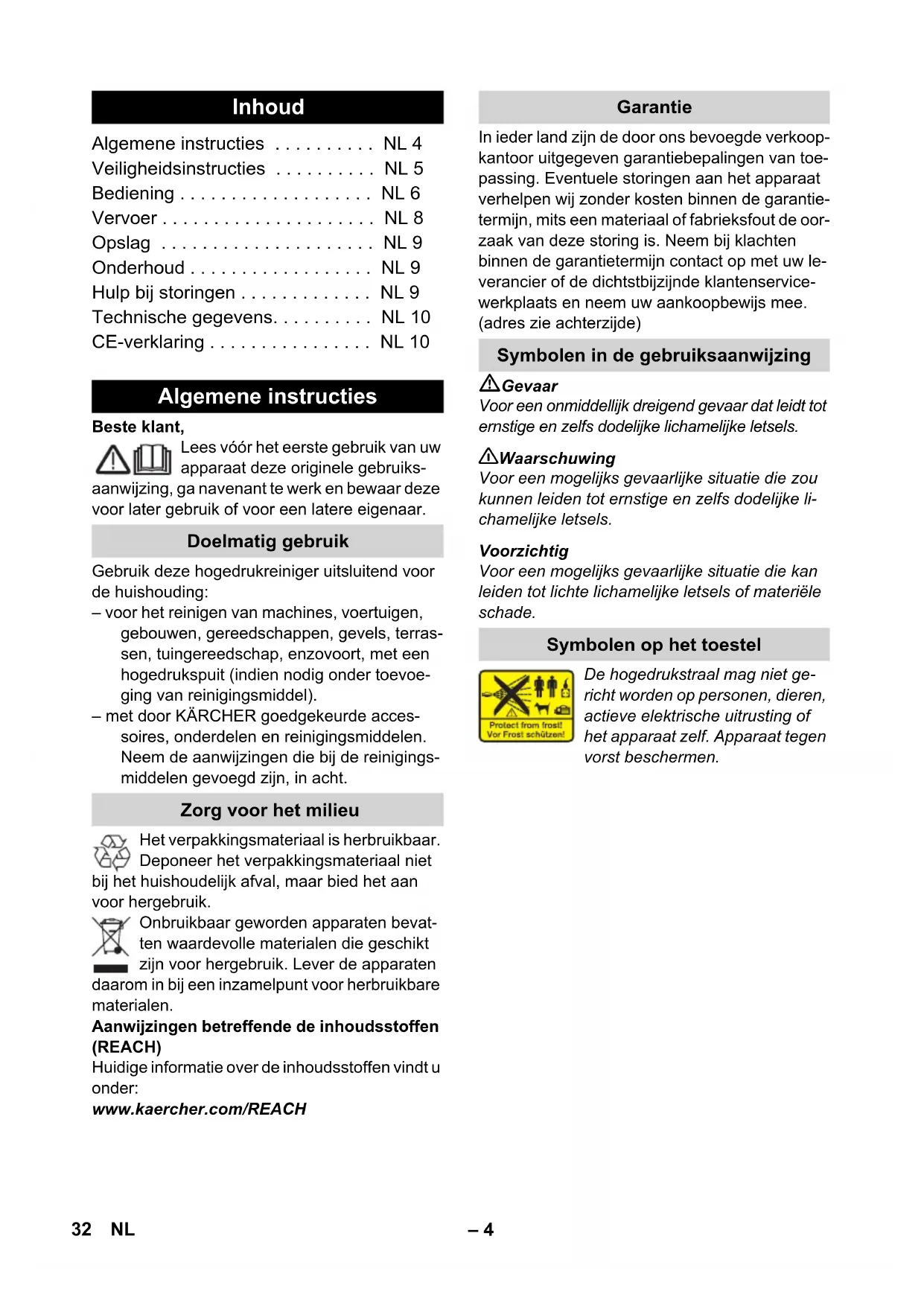89 dB(A) Dichiarazione di conformità CE Prodotto: Idropulitrice Modelo: 1.674-xxx Direttive CE pertinenti 2006/42/CE (+2009/127/CE) 2004/108/CE 2000/14/CE Norme armonizzate applicate EN 55014–1: 2006 + A1: 2009 EN 55014–2: 1997 + A2: 2008 EN 60335–1 EN 60335–2–79 EN 61000–3–2: 2006 + A2: 2009 EN 61000–3–3: 2008 EN 62233: 2008 Procedura di valutazione della conformità ap- plicata 2000/14/CE: Allegato V Livello di potenza sonora dB(A) Misurato: 86 Garantito: 89 CEO Head of Approbation 31IT– 4 Beste klant, Lees vóór het eerste gebruik van uw apparaat deze originele gebruiks- aanwijzing, ga navenant te werk en bewaar deze voor later gebruik of voor een latere eigenaar. Gebruik deze hogedrukreiniger uitsluitend voor de huishouding: – voor het reinigen van machines, voertuigen, gebouwen, gereedschappen, gevels, terras- sen, tuingereedschap, enzovoort, met een hogedrukspuit (indien nodig onder toevoe- ging van reinigingsmiddel). – met door KÄRCHER goedgekeurde acces- soires, onderdelen en reinigingsmiddelen. Neem de aanwijzingen die bij de reinigings- middelen gevoegd zijn, in acht. Het verpakkingsmateriaal is herbruikbaar. Deponeer het verpakkingsmateriaal niet bij het huishoudelijk afval, maar bied het aan voor hergebruik. Onbruikbaar geworden apparaten bevat- ten waardevolle materialen die geschikt zijn voor hergebruik. Lever de apparaten daarom in bij een inzamelpunt voor herbruikbare materialen. Aanwijzingen betreffende de inhoudsstoffen (REACH) Huidige informatie over de inhoudsstoffen vindt u onder: www.kaercher.com/REACH In ieder land zijn de door ons bevoegde verkoop- kantoor uitgegeven garantiebepalingen van toe- passing. Eventuele storingen aan het apparaat verhelpen wij zonder kosten binnen de garantie- termijn, mits een materiaal of fabrieksfout de oor- zaak van deze storing is. Neem bij klachten binnen de garantietermijn contact op met uw le- verancier of de dichtstbijzijnde klantenservice- werkplaats en neem uw aankoopbewijs mee. (adres zie achterzijde) Gevaar Voor een onmiddellijk dreigend gevaar dat leidt tot ernstige en zelfs dodelijke lichamelijke letsels. 몇 Waarschuwing Voor een mogelijks gevaarlijke situatie die zou kunnen leiden tot ernstige en zelfs dodelijke li- chamelijke letsels. Voorzichtig Voor een mogelijks gevaarlijke situatie die kan leiden tot lichte lichamelijke letsels of materiële schade. De hogedrukstraal mag niet ge- richt worden op personen, dieren, actieve elektrische uitrusting of het apparaat zelf. Apparaat tegen vorst beschermen. Inhoud Algemene instructies . . . . . . . . . . NL 4 Veiligheidsinstructies . . . . . . . . . . NL 5 Bediening . . . . . . . . . . . . . . . . . . . NL 6 Vervoer . . . . . . . . . . . . . . . . . . . . . NL 8 Opslag . . . . . . . . . . . . . . . . . . . . . NL 9 Onderhoud . . . . . . . . . . . . . . . . . . NL 9 Hulp bij storingen . . . . . . . . . . . . . NL 9 Technische gegevens. . . . . . . . . . NL 10 CE-verklaring . . . . . . . . . . . . . . . . NL 10 Algemene instructies Doelmatig gebruik Zorg voor het milieu Garantie Symbolen in de gebruiksaanwijzing Symbolen op het toestel 32 NL– 5 Gevaar Pak de stekker en wandcontactdoos nooit met vochtige handen beet. Neem het apparaat niet in bedrijf als de ne- taansluiting of belangrijke onderdelen van het apparaat (zoals veiligheidsinrichtingen, hoge- drukslangen of handspuitpistool) beschadigd zijn. Controleer vóór gebruik altijd of netsnoer en - stekker onbeschadigd zijn. Laat een bescha- digd netsnoer onmiddellijk vervangen door een bevoegde medewerker van de technische dienst of een electricien. Controleer de hogedrukslang vóór ieder ge- bruik altijd op beschadigingen. Vervang een beschadigde hogedrukslang onmiddellijk. U mag het apparaat niet in gebieden met ex- plosiegevaar gebruiken. Wanneer u het apparaat in gevaarlijke gebieden gebruikt (bijvoorbeeld tankstations), moet u de betreffende veiligheidsvoorschriften naleven. Hogedrukstralen kunnen gevaarlijk zijn wanneer u het apparaat ondeskundig gebruikt. U mag de straal niet richten op personen, dieren, actieve elektrische uitrusting of het apparaat zelf. De hogedrukstraal niet op anderen of op uzelf, richten om bijvoorbeeld kleding of schoeisel te reinigen. Sproei geen voorwerpen af die stoffen bevat- ten die gevaarlijk zijn voor de gezondheid (bij- voorbeeld asbest). Hogedrukstralen kunnen banden / ventielen van voertuigen beschadigen, waardoor de banden springen. Eerste teken hiervoor is een verkleuring van de band. Beschadigde voer- tuigbanden / ventielen zijn levensgevaarlijk. Houd minstens 30 cm straalafstand aan bij het reinigen! Explosiegevaar! Geen brandbare vloeistoffen sproeien. Zuig nooit oplosmiddelhoudende vloeistof of onverdunde zuren en oplosmiddelen op! Tot deze stoffen behoren bijvoorbeeld benzine, verfverdunner en stookolie. De sproeinevel is zeer licht ontvlambaar, explosief en giftig. Gebruik geen aceton, onverdund zuur of op- losmiddel, omdat die de materialen aantas- ten die in het apparaat zijn verwerkt. 몇 Waarschuwing Netsnoer en stekkers van een verlengsnoer moeten waterdicht zijn en mogen niet in het water liggen. Ongeschikte verlengsnoeren kunnen ge- vaarlijk zijn. Gebruik in de open lucht alleen daarvoor goedgekeurde en overeenkomstig gemerkte verlengsnoeren met een voldoen- de grote diameter: