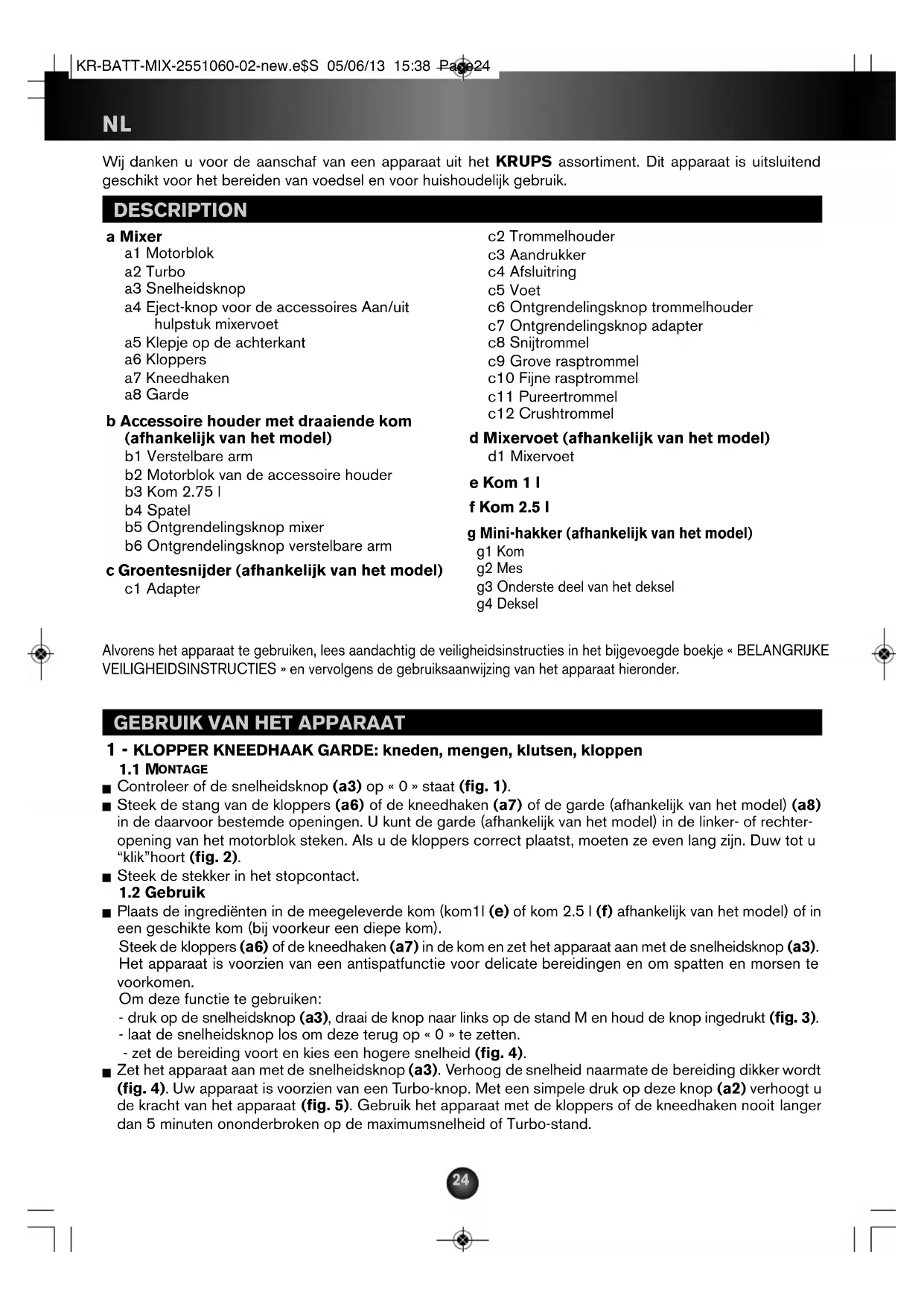 Alvorens het apparaat te gebruiken, lees aandachtig de veiligheidsinstructies in het bijgevoegde boekje « BELANGRIJKE VEILIGHEIDSINSTRUCTIES » en vervolgens de gebruiksaanwijzing van het apparaat hieronder. KR-BATT-MIX-2551060-02-new.e$S 05/06/13 15:38 Page24NL