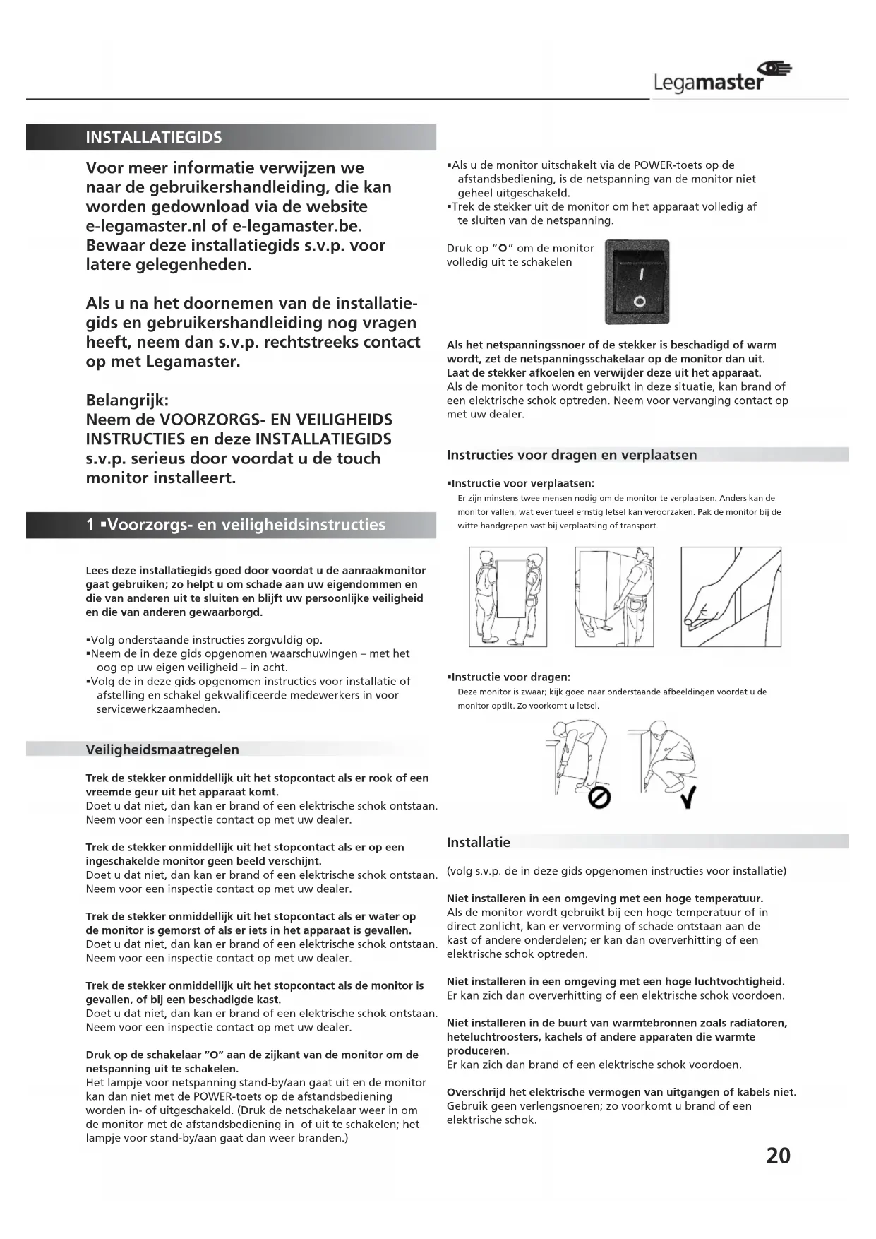 une protection raisonnable contre les interférences nuisibles lors de l’utilisation de l’appareil dans un environnement commercial. Cet appareil génère et consomme de l’énergie sous forme d'ondes radioélectriques et peut donc éventuellement entraîner une exposition à ces ondes. Lorsque l’appareil n’est pas installé et utilisé conformément aux consignes données, il peut perturber les radiocommunications. Lorsqu’il est utilisé dans des zones rési- dentielles, il peut y avoir des dysfonctionnements. Il revient à l’utilisateur de remédier à ces dysfonctionnements. Avertissement Ce produit est de classe A. Utilisé dans une zone résidentielle, il peut perturber les radiocommunications. Le cas échéant, il incombe à l’utilisateur de prendre les mesures nécessaires pour y remédier. Cet appareil est soumis aux dispositions de la section 15 des réglementations FCC. Son utilisation est soumises aux deux conditions suivantes: (1) Cet appareil ne doit pas générer d’interférences nuisibles, et (2) Cet appareil doit absorber les interférences reçues bien qu’elles puissent entraîner des dysfonctionnements. EN 55022_EN 61000-3-2_EN-61000-3-3 EN 55024 EN 60950-1 [Directive «bas voltage» (73/23/EEC)] Les informations contenues dans ce document peuvent être modifiées sans notification préalable. 2012 Legamaster International B.V. Tous droits réservés. Toute reproduction, sous quelle forme que ce soit, est strictement interdite sauf autorisation écrite de Legamaster International. Les marques utilisées dans ce texte: Legamaster et le logo Legamaster sont des marques de edding AG; Windows est une marque déposée de Microsoft Corporation, Nextwindow est une marque déposée de Nextwindow. D’autres marques et dénominations commerciales peuvent être utilisées dans ce document pour se référer soit aux entités revendiquant les marques et dénominations soit à leurs produits. Legamaster International renonce à tout droit de propriété sur les marques et dénominations commerciales autres que les siennes.20 Voor meer informatie verwijzen we naar de gebruikershandleiding, die kan worden gedownload via de website e-legamaster.nl of e-legamaster.be. Bewaar deze installatiegids s.v.p. voor latere gelegenheden. Als u na het doornemen van de installatie- gids en gebruikershandleiding nog vragen heeft, neem dan s.v.p. rechtstreeks contact op met Legamaster. Belangrijk: Neem de VOORZORGS- EN VEILIGHEIDS INSTRUCTIES en deze INSTALLATIEGIDS s.v.p. serieus door voordat u de touch monitor installeert. Lees deze installatiegids goed door voordat u de aanraakmonitor gaat gebruiken; zo helpt u om schade aan uw eigendommen en die van anderen uit te sluiten en blijft uw persoonlijke veiligheid en die van anderen gewaarborgd. Volg onderstaande instructies zorgvuldig op. Neem de in deze gids opgenomen waarschuwingen – met het oog op uw eigen veiligheid – in acht. Volg de in deze gids opgenomen instructies voor installatie of afstelling en schakel gekwalificeerde medewerkers in voor servicewerkzaamheden. Veiligheidsmaatregelen Trek de stekker onmiddellijk uit het stopcontact als er rook of een vreemde geur uit het apparaat komt. Doet u dat niet, dan kan er brand of een elektrische schok ontstaan. Neem voor een inspectie contact op met uw dealer. Trek de stekker onmiddellijk uit het stopcontact als er op een ingeschakelde monitor geen beeld verschijnt. Doet u dat niet, dan kan er brand of een elektrische schok ontstaan. Neem voor een inspectie contact op met uw dealer. Trek de stekker onmiddellijk uit het stopcontact als er water op de monitor is gemorst of als er iets in het apparaat is gevallen. Doet u dat niet, dan kan er brand of een elektrische schok ontstaan. Neem voor een inspectie contact op met uw dealer. Trek de stekker onmiddellijk uit het stopcontact als de monitor is gevallen, of bij een beschadigde kast. Doet u dat niet, dan kan er brand of een elektrische schok ontstaan. Neem voor een inspectie contact op met uw dealer. Druk op de schakelaar ”O” aan de zijkant van de monitor om de netspanning uit te schakelen. Het lampje voor netspanning stand-by/aan gaat uit en de monitor kan dan niet met de POWER-toets op de afstandsbediening worden in- of uitgeschakeld. (Druk de netschakelaar weer in om de monitor met de afstandsbediening in- of uit te schakelen; het lampje voor stand-by/aan gaat dan weer branden.) Als u de monitor uitschakelt via de POWER-toets op de afstandsbediening, is de netspanning van de monitor niet geheel uitgeschakeld. Trek de stekker uit de monitor om het apparaat volledig af te sluiten van de netspanning. Druk op “” om de monitor volledig uit te schakelen Als het netspanningssnoer of de stekker is beschadigd of warm wordt, zet de netspanningsschakelaar op de monitor dan uit. Laat de stekker afkoelen en verwijder deze uit het apparaat. Als de monitor toch wordt gebruikt in deze situatie, kan brand of een elektrische schok optreden. Neem voor vervanging contact op met uw dealer. Instructies voor dragen en verplaatsen Instructie voor verplaatsen: Er zijn minstens twee mensen nodig om de monitor te verplaatsen. Anders kan de