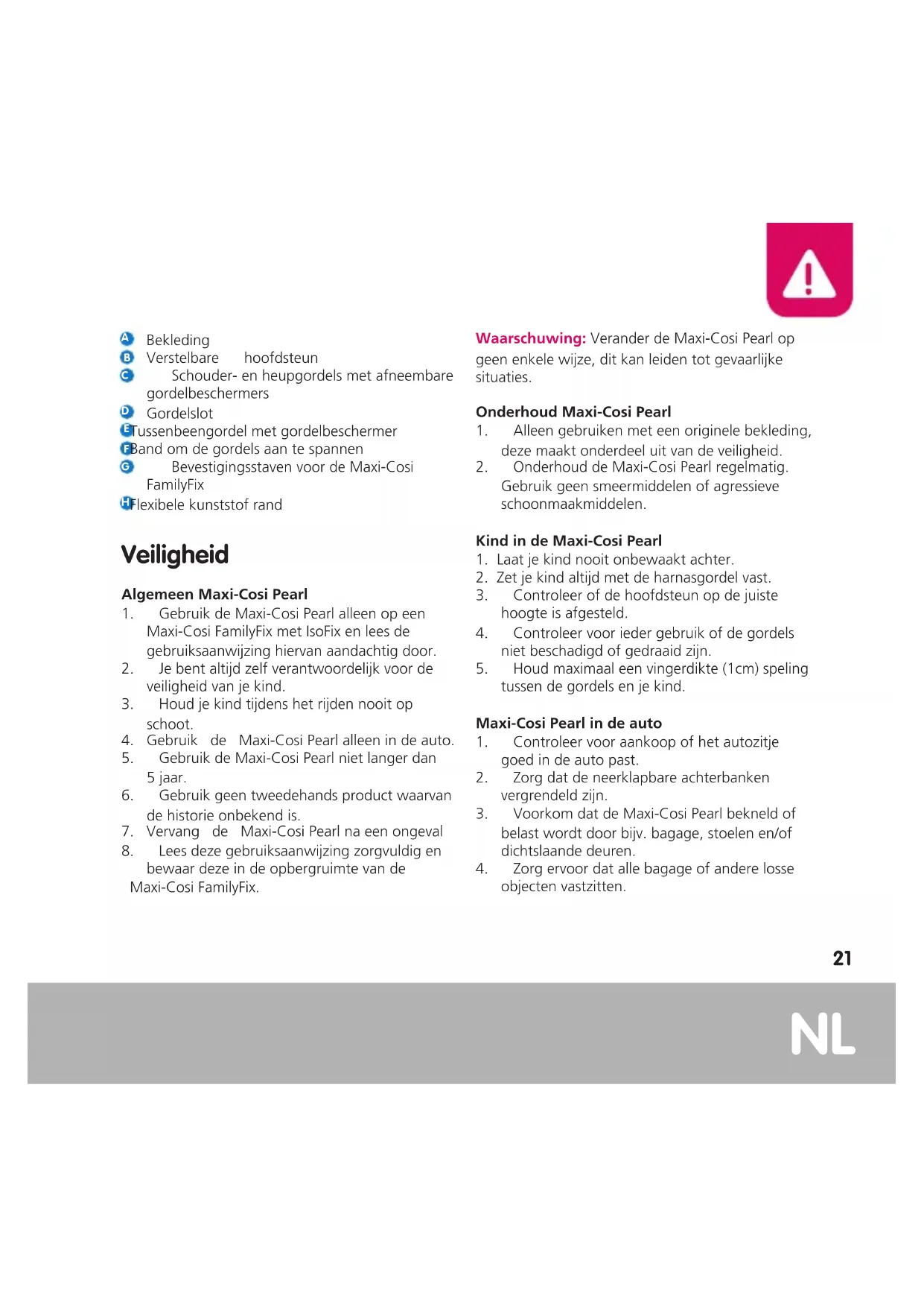 bewaar deze in de opbergruimte van de Maxi-Cosi FamilyFix. Waarschuwing: Verander de Maxi-Cosi Pearl op geen enkele wijze, dit kan leiden tot gevaarlijke situaties. Onderhoud Maxi-Cosi Pearl