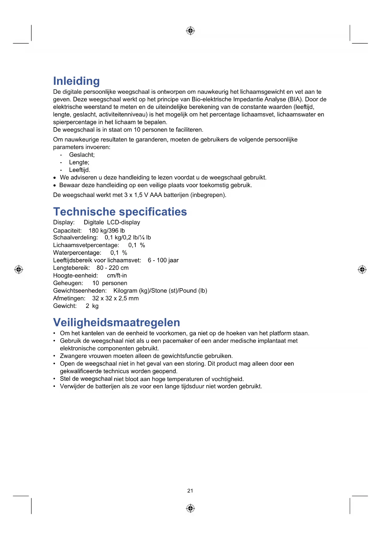 - Bewaar deze handleiding op een veilige plaats voor toekomstig gebruik. De weegschaal werkt met 3 x 1,5 V AAA batterijen (inbegrepen). Technische specificaties Display: Digitale LCD-display Capaciteit: 180 kg/396 lb Schaalverdeling: 0,1 kg/0,2 lb/¼ lb Lichaamsvetpercentage: 0,1 % Waterpercentage: 0,1 % Leeftijdsbereik voor lichaamsvet: 6 - 100 jaar Lengtebereik: 80 - 220 cm Hoogte-eenheid: cm/ft-in Geheugen: 10 personen Gewichtseenheden: Kilogram (kg)/Stone (st)/Pound (lb) Afmetingen: 32 x 32 x 2,5 mm Gewicht: 2 kg Veiligheidsmaatregelen