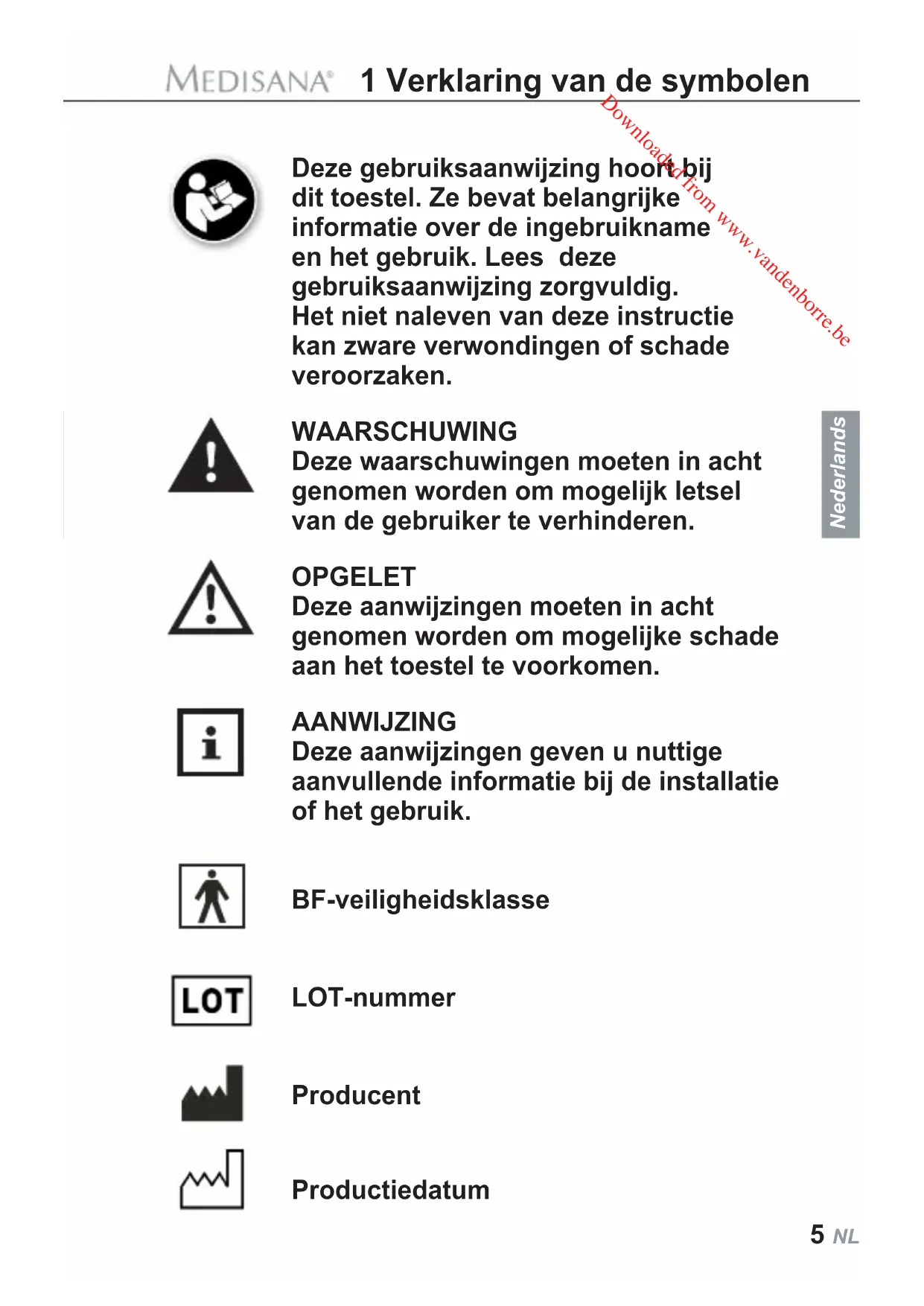 Downloaded from www.vandenborre.be1 Verklaring van de symbolen 5 NL Deze gebruiksaanwijzing hoort bij dit toestel. Ze bevat belangrijke informatie over de ingebruikname en het gebruik. Lees deze gebruiksaanwijzing zorgvuldig. Het niet naleven van deze instructie kan zware verwondingen of schade veroorzaken. WAARSCHUWING Deze waarschuwingen moeten in acht genomen worden om mogelijk letsel van de gebruiker te verhinderen. OPGELET Deze aanwijzingen moeten in acht genomen worden om mogelijke schade aan het toestel te voorkomen. AANWIJZING Deze aanwijzingen geven u nuttige aanvullende informatie bij de installatie of het gebruik. BF-veiligheidsklasse LOT-nummer Producent Productiedatum Nederlands Downloaded from www.vandenborre.be2 Veiligheidsmaatregelen 6 NL BELANGRIJKE AANWIJZINGEN! ABSOLUUT BEWAREN! Lees de gebruiksaanwijzing, in het bijzonder de veiligheidsinstructies, zorvuldig door vooraleer u het apparaat gebruikt en bewaar de gebruiks- aanwijzing voor verder gebruik. Als u het toestel aan derden doorgeeft, geef dan deze gebruiksaanwijzing absoluut mee. Veiligheidsmaatregelen