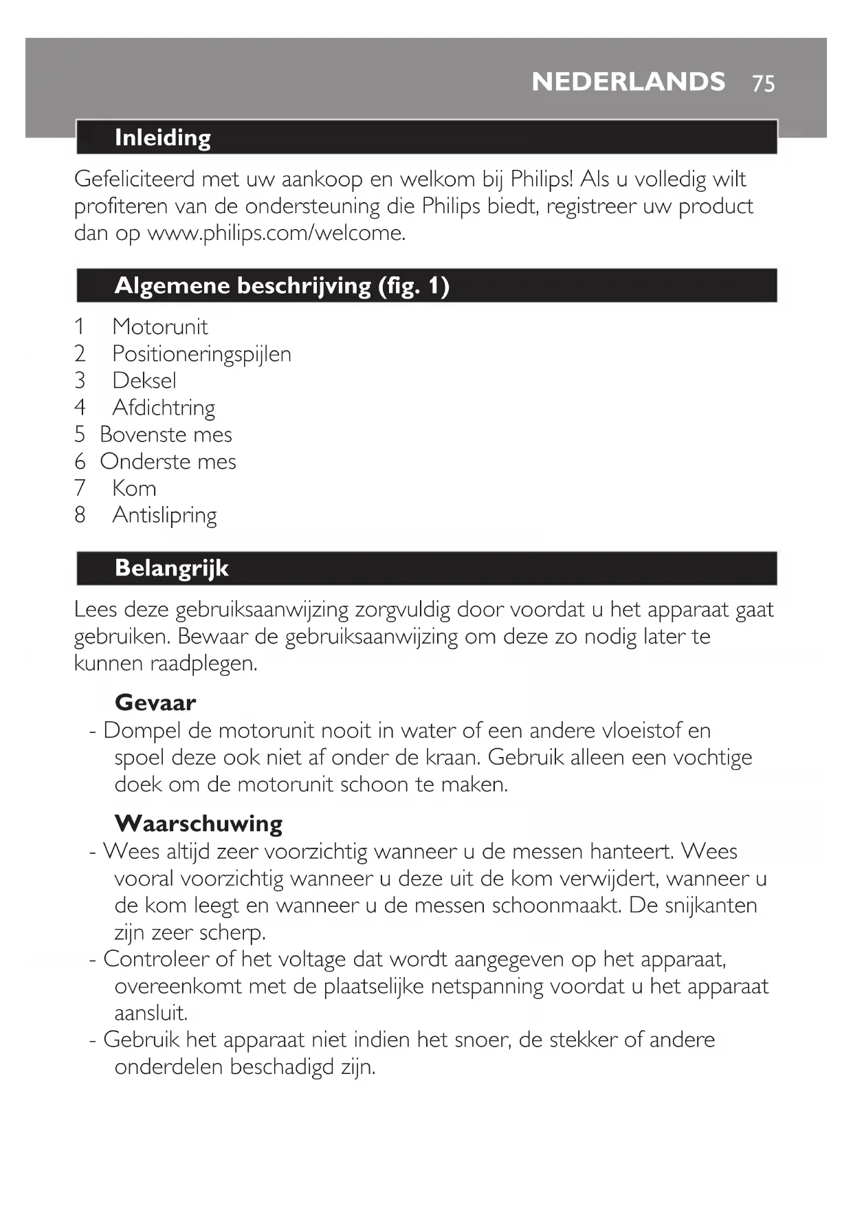 - 양념용 허브(파슬리, 타임, 로바지) 1 애호박을씻고당근,양파,감자,마늘은껍질을벗깁니다. 2모든야채를잘게썰어수프용고기,물과허브를넣고약 15분간익힙니다. 익힌 야채를 잠깐 식힙니다. 3크림을넣고부드러워질때까지약40초간블렌딩합니다. 한국어7475 Inleiding Gefeliciteerd met uw aankoop en welkom bij Philips! Als u volledig wilt profiteren van de ondersteuning die Philips biedt, registreer uw product dan op www.philips.com/welcome. Algemene beschrijving (fig. 1) 1 Motorunit 2 Positioneringspijlen 3 Deksel 4 Afdichtring 5 Bovenste mes 6 Onderste mes 7 Kom 8 Antislipring Belangrijk Lees deze gebruiksaanwijzing zorgvuldig door voordat u het apparaat gaat gebruiken. Bewaar de gebruiksaanwijzing om deze zo nodig later te kunnen raadplegen. Gevaar - Dompel de motorunit nooit in water of een andere vloeistof en spoel deze ook niet af onder de kraan. Gebruik alleen een vochtige doek om de motorunit schoon te maken. Waarschuwing - Wees altijd zeer voorzichtig wanneer u de messen hanteert. Wees vooral voorzichtig wanneer u deze uit de kom verwijdert, wanneer u de kom leegt en wanneer u de messen schoonmaakt. De snijkanten zijn zeer scherp. - Controleer of het voltage dat wordt aangegeven op het apparaat, overeenkomt met de plaatselijke netspanning voordat u het apparaat aansluit. - Gebruik het apparaat niet indien het snoer, de stekker of andere onderdelen beschadigd zijn. NEDERLANDS- Indien het netsnoer beschadigd is, moet u het laten vervangen door Philips, een door Philips geautoriseerd servicecentrum of personen met vergelijkbare kwalificaties om gevaar te voorkomen. - Dit apparaat is niet bedoeld voor gebruik door personen (waaronder kinderen) met verminderde lichamelijke, zintuiglijke of geestelijke vermogens, of die gebrek aan ervaring of kennis hebben, tenzij iemand die verantwoordelijk is voor hun veiligheid toezicht op hen houdt of hun heeft uitgelegd hoe het apparaat dient te worden gebruikt. - Houd toezicht op jonge kinderen om te voorkomen dat ze met het apparaat gaan spelen. - Laat kinderen de hakmolen niet zonder toezicht gebruiken. Let op - Overschrijd de hoeveelheden en bewerkingstijden aangegeven in de tabel niet. - Snijd grote ingrediënten in kleinere stukjes van ongeveer 2 cm voordat u deze in de handblender doet. - Vul de kom nooit met ingrediënten die heter zijn dan 80°C. - Als de ingrediënten aan de wand van de kom blijven kleven, verwijder dan de motorunit, open het deksel en verwijder de ingrediënten van de wand met een spatel of door vloeistof toe te voegen. - Gebruik geen accessoires of onderdelen van andere fabrikanten of die niet specifiek door Philips worden aanbevolen. Als u dergelijke accessoires of onderdelen gebruikt, vervalt de garantie. - Dit apparaat is uitsluitend bedoeld voor huishoudelijk gebruik. Elektromagnetische velden (EMV) Dit Philips-apparaat voldoet aan alle richtlijnen met betrekking tot elektromagnetische velden (EMV). Mits het apparaat op de juiste wijze en volgens de instructies in deze gebruiksaanwijzing wordt gebruikt, is het veilig te gebruiken volgens het nu beschikbare wetenschappelijke bewijs. NEDERLANDS76Voor het eerste gebruik - Maak alle onderdelen die in aanraking komen met voedsel grondig schoon voordat u het apparaat voor het eerst gebruikt (zie hoofdstuk ‘Schoonmaken’). Het apparaat gebruiken 1 Plaats het bovenste mes op het onderste mes (1) en draai het bovenste mes linksom tot het vergrendelt (2) (fig. 2). 2 Plaats de bevestigde mesunit op de pin in het midden van de kom (fig. 3). 3 Doe de ingrediënten in de kom (fig. 4). Raadpleeg de onderstaande tabel voor de aanbevolen hoeveelheden en bewerkingstijden. U bereikt het beste resultaat als u zich aan de hoeveelheden en bewerkingstijden in de tabel houdt. Maximale hoeveelheden en bewerkingstijden Droge ingrediënten hakken Ingrediënten Max. hoeveelheid Tijd Uien in blokjes 100 g 3-4 pulsen Peterselie 60 g 10 pulsen Mager rundvlees (hoge kwaliteit) in blokjes van 2-3