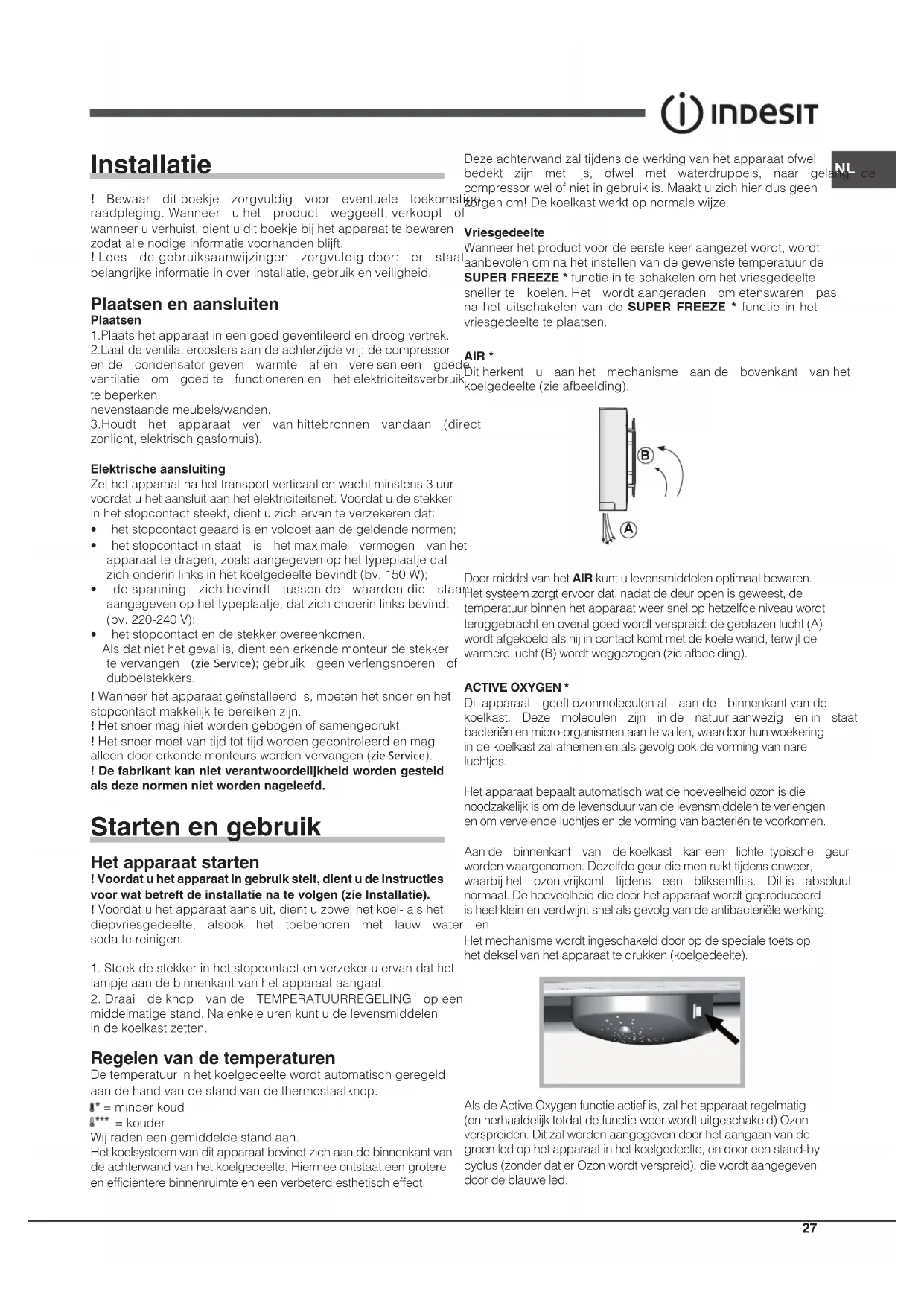 Installatie ! Bewaar ditboekje zorgvuldig voor eventuele toekomstige raadpleging.Wanneer uhet product weggeeft,verkoopt of wanneeruverhuist,dientuditboekjebijhetapparaattebewaren zodatallenodigeinformatievoorhandenblijft. !Lees degebruiksaanwijzingen zorgvuldigdoor: er staat belangrijkeinformatieinoverinstallatie,gebruikenveiligheid. Plaatsen en aansluiten Plaatsen 1.Plaatshetapparaatineengoedgeventileerdendroogvertrek. 2.Laatdeventilatieroostersaandeachterzijdevrij:decompressor ende condensatorgeven warmte afen vereiseneen goede ventilatie om goedte functionerenen hetelektriciteitsverbruik tebeperken. nevenstaandemeubels/wanden. 3.Houdt het apparaat ver vanhittebronnen vandaan (direct zonlicht,elektrischgasfornuis). Elektrische aansluiting Zethetapparaatnahettransportverticaalenwachtminstens3uur voordatuhetaansluitaanhetelektriciteitsnet.Voordatudestekker inhetstopcontactsteekt,dientuzichervanteverzekerendat: