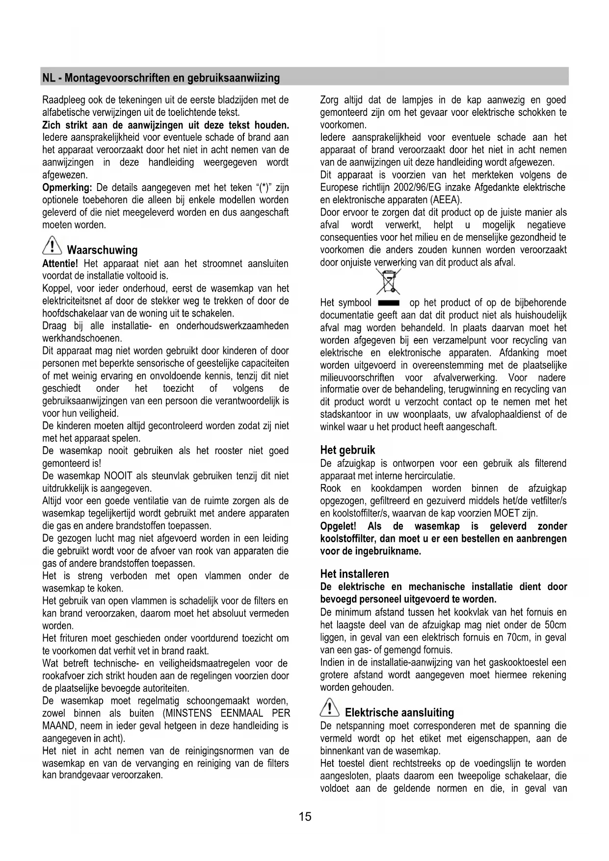 Opgelet! Als de wasemkap is geleverd zonder