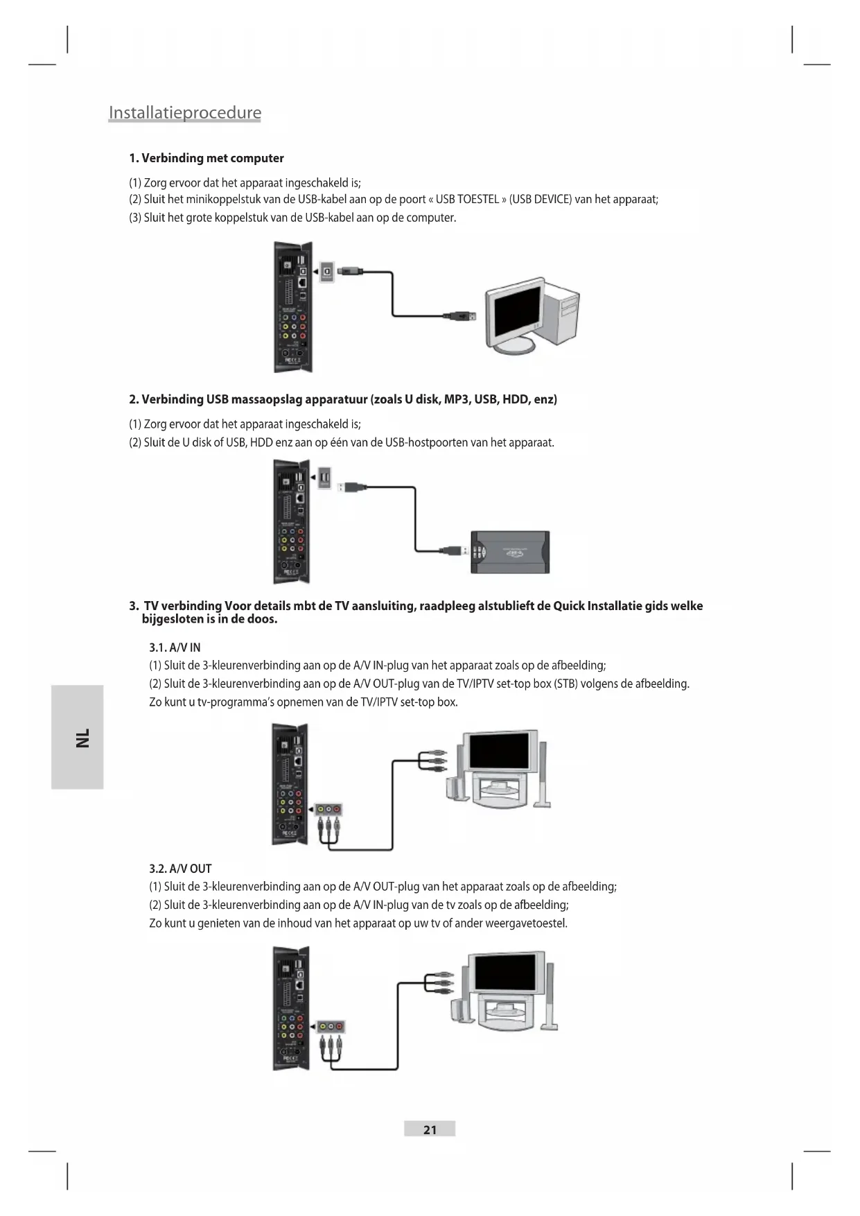 bijgesloten is in de doos. 3.1. A/V IN (1) Sluit de 3-kleurenverbinding aan op de A/V IN-plug van het apparaat zoals op de afbeelding; (2) Sluit de 3-kleurenverbinding aan op de A/V OUT-plug van de TV/IPTV set-top box (STB) volgens de afbeelding. Zo kunt u tv-programma’s opnemen van de TV/IPTV set-top box.