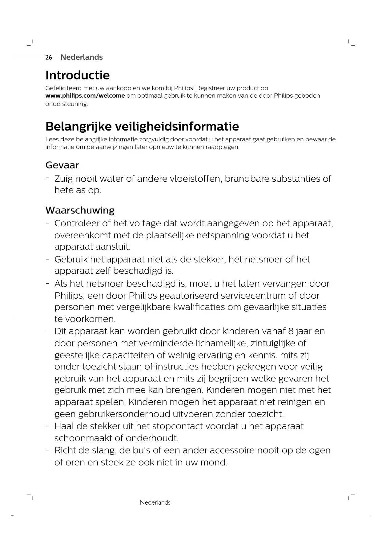 Dit apparaat kan worden gebruikt door kinderen vanaf 8 jaar en door personen met verminderde lichamelijke, zintuiglijke of geestelijke capaciteiten of weinig ervaring en kennis, mits zij onder toezicht staan of instructies hebben gekregen voor veilig gebruik van het apparaat en mits zij begrijpen welke gevaren het gebruik met zich mee kan brengen. Kinderen mogen niet met het apparaat spelen. Kinderen mogen het apparaat niet reinigen en geen gebruikersonderhoud uitvoeren zonder toezicht.