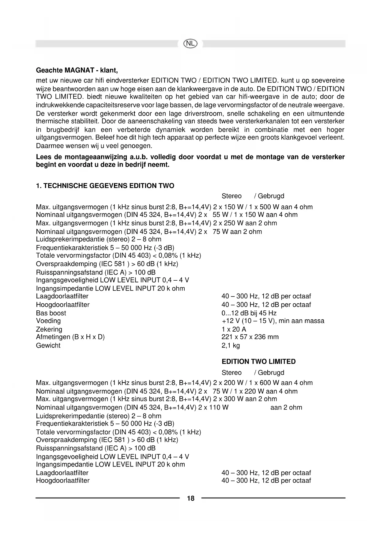 Geachte MAGNAT - klant, met uw nieuwe car hifi eindversterker EDITION TWO / EDITION TWO LIMITED. kunt u op soevereine wijze beantwoorden aan uw hoge eisen aan de klankweergave in de auto. De EDITION TWO / EDITION TWO LIMITED. biedt nieuwe kwaliteiten op het gebied van car hifi-weergave in de auto; door de indrukwekkende capaciteitsreserve voor lage bassen, de lage vervormingsfactor of de neutrale weergave. De versterker wordt gekenmerkt door een lage driverstroom, snelle schakeling en een uitmuntende thermische stabiliteit. Door de aaneenschakeling van steeds twee versterkerkanalen tot een versterker in brugbedrijf kan een verbeterde dynamiek worden bereikt in combinatie met een hoger uitgangsvermogen. Beleef hoe dit high tech apparaat op perfecte wijze een groots klankgevoel verleent. Daarmee wensen wij u veel genoegen. Lees de montageaanwijzing a.u.b. volledig door voordat u met de montage van de versterker begint en voordat u deze in bedrijf neemt.