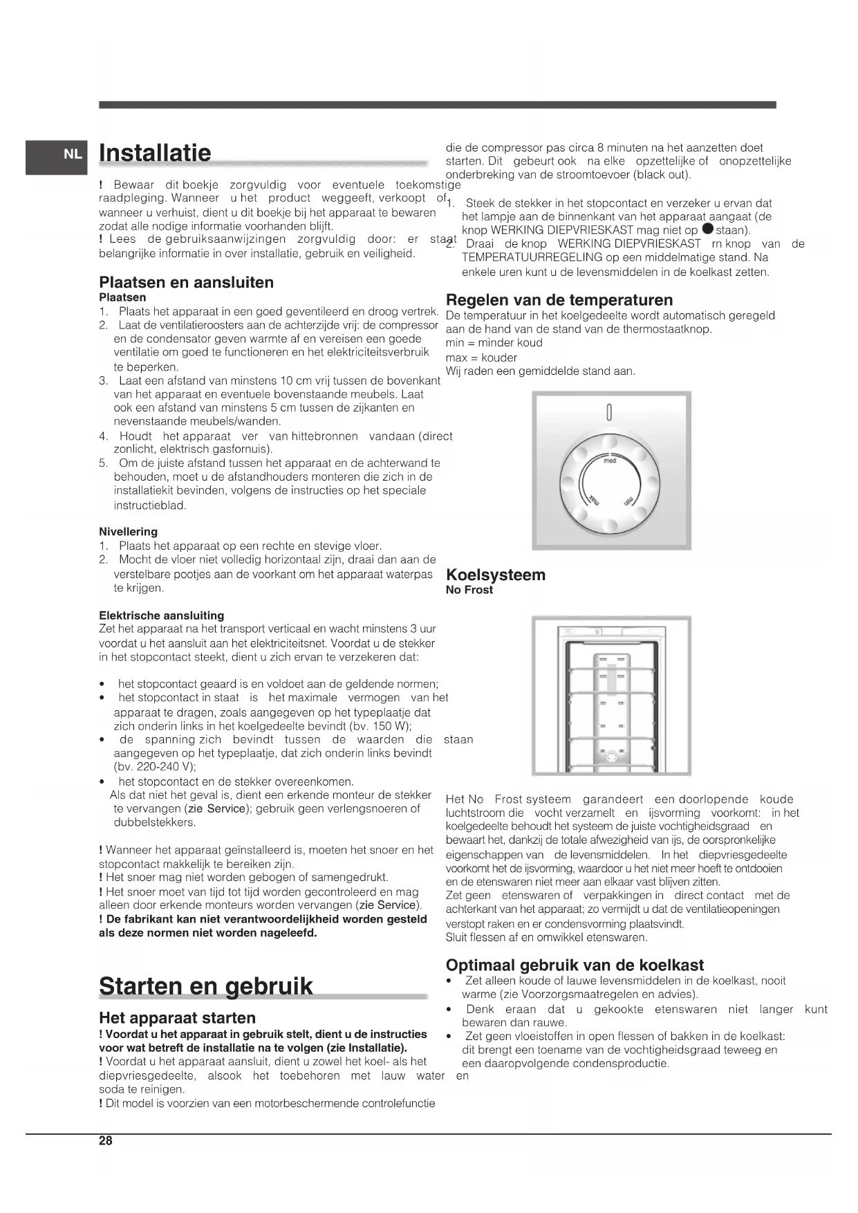 DitapparaatvoldoetaandevolgendeEURichtlijnen:-73/23/EEGvan19/02/73(Laagspanning)endaaropvolgendewijzigingen;-89/336/EEGvan03/05/89(ElektromagnetischeCompatibiliteit)endaaropvolgendewijzigingen;-2002/96/CE. Algemene veiligheid • Ditapparaatisvervaardigdvoorniet-professioneel gebruikbinnenshuis.• Hetapparaatdienttewordengebruiktvoorhetbewarenenhetinvriezenvanlevensmiddelen.Hetdientuitsluitenddoorvolwassenentewordenbediend,volgensdeaanwijzingendieaangegevenzijninditinstructieboekje.• Hetapparaatdientnietbuitenshuistewordengeplaatst,ooknietinoverdektetoestand.Het is erg gevaarlijk als het inaanrakingkomtmetregenofalshetonweert.• Raakhetapparaatnietblootsvoetsofmetnattehandenofvoetenaan.• Raaknooitdekoelelementenaandebinnenkantaan:uzouzichkunnenverbrandenofverwonden.• Haaldestekkernooituithetstopcontactdooraanhetsnoertetrekken.• Maakdekoelkastnietschoonofvoergeenonderhouduitalsdestekkernoginhetstopcontactzit. Hetisnietvoldoendelangerdantweesecondendetoets op dedisplayingedrukttehoudenomelkeelektrischeverbindingteverbreken.• Alshetapparaatdefectis,magunooitaanhetinternesysteemsleutelenomeenreparatieuittevoeren.• Gebruikindevakkenwaaringevrorenlevensmiddelenwordenbewaardgeenscherpeofpuntigevoorwerpenofelektrischeapparatendienietdoordefabrikantwordenaanbevolen.• Plaatsnooitijsblokjesdienetuitdediepvrieskastkomeninuwmond.• Dit apparaat is niet geschikt voor gebruikdoorpersonen(inclusief kinderen) met fysieke, sensorische of mentalebeperkingen,ofdiegeenervaringofkennishebben,tenzijzedooreenpersoondieverantwoordelijkisvoorhunveiligheidbegeleidwordenbijofgeïnstrueerdzijnoverhetgebruikvanhetapparaat.Kinderenmoetengecontroleerdwordenomtezorgendatzenietmethetapparaatspelen.• Hetverpakkingsmateriaalisgeenspeelgoedvoorkinderen. Afvalverwijdering • Verwijderingvan het verpakkingsmateriaal: houdt u aandeplaatselijke normen, zodat het verpakkingsmateriaalhergebruiktkanworden.• DeEuropese Richtlijn 2002/96/EC over Vernietiging vanElectrische en Electronische Apparatuur (WEEE), vereistdatoudehuishoudelijke electrische apparaten niet mogenvernietigdviadenormaleongesorteerdeafvalstroom.Oudeapparaten moeten apart worden ingezameld om zo hethergebruikvandegebruiktematerialenteoptimaliserenendenegatieveinvloedopdegezondheidenhetmilieutereduceren.Hetsymboolophetproductvande“afvalcontainermeteenkruiserdoor”herinnertuaanuwverplichting,datwanneeruhetapparaatvernietigt,hetapparaatapartmoetwordeningezameld. Consumentenmoetencontactopnemen met de localeautoriteitenvoorinformatieoverdejuistewijzevanvernietigingvanhunoudeapparaat. Het milieu sparen en respecteren • Plaatshetapparaatineenkoele,goedgeventileerderuimte,behoedthetvoordirectezonnestralen,plaatshetnietdichtbijeenwarmtebron.• Laatdedeur,wanneeruetenswarenindekoel-ofdiepvrieskastzetoferuithaalt,zokortmogelijkopenstaan. Elke keer dat de deur opengaat ontstaat eenaanzienlijkenergieverlies.• Vulhetapparaatnietmetteveeletenswaren:vooreenoptimaleconservering moet de koude luchtstroom vrijuit kunnencirculeren.Alsudecirculatiebelemmert,zaldecompressorconstantblijvenwerken.• Zetgeenwarmelevensmiddeleninhetapparaat:dezezoudenNL